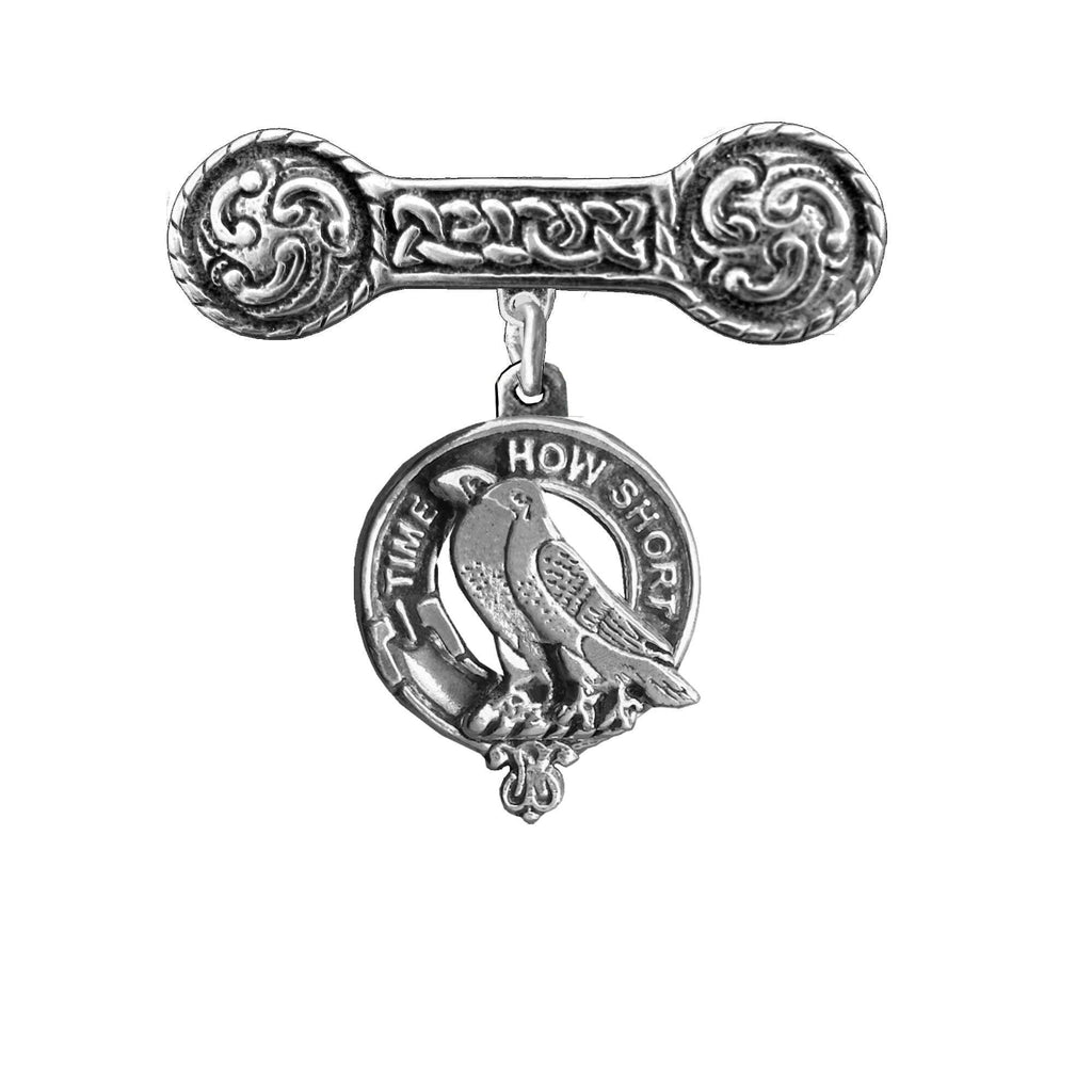 Our stunning Clan crest Iona bar brooch is a combination of old and new. The Iona bar design was first made on the small Holy Isle of Iona off the west coast of Scotland and the Clan crest is designed and made in our small Studio. The Iona bar is decorated with Celtic "bosses" on each end and is connected by a Celtic interlace design, the symbol of everlasting life. The Clan crest is suspended from the center of this antique design.