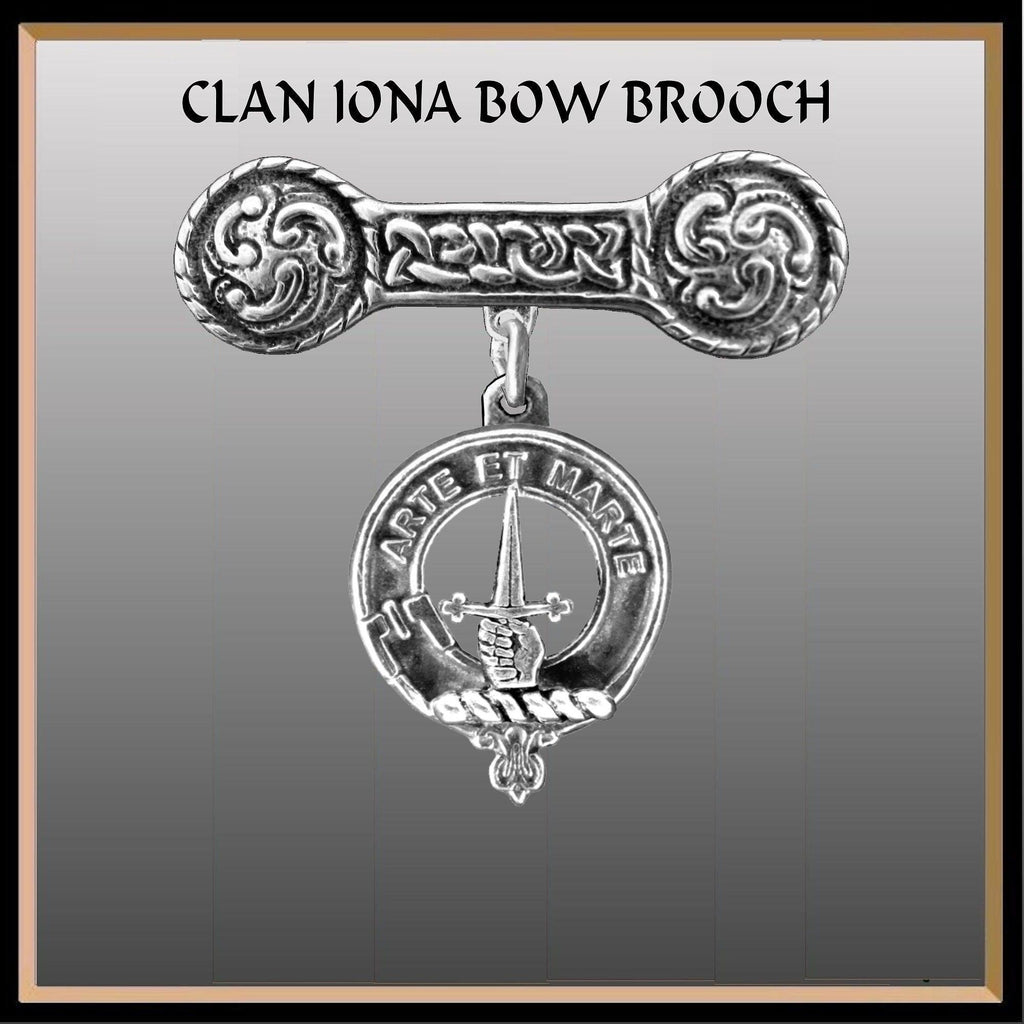 Our stunning Clan crest Iona bar brooch is a combination of old and new. The Iona bar design was first made on the small Holy Isle of Iona off the west coast of Scotland and the Clan crest is designed and made in our small Studio. The Iona bar is decorated with Celtic "bosses" on each end and is connected by a Celtic interlace design, the symbol of everlasting life. The Clan crest is suspended from the center of this antique design.