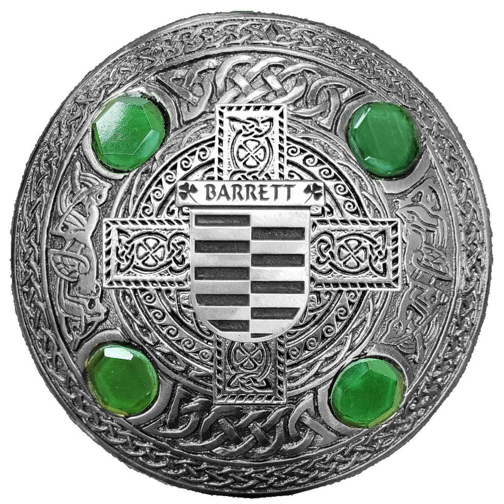 Barrett Irish Coat of Arms Celtic Cross Plaid Brooch with Green Stones