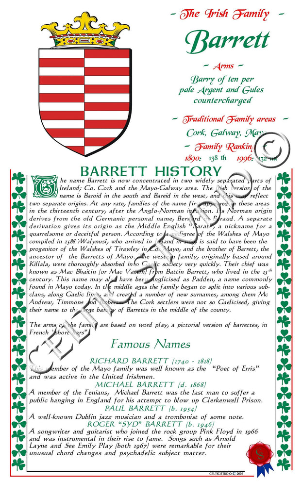 Your family's Irish history includes the Coat of Arms beautifully displayed in full colour with a description of the arms, traditional family areas and family ranking displayed beside it.