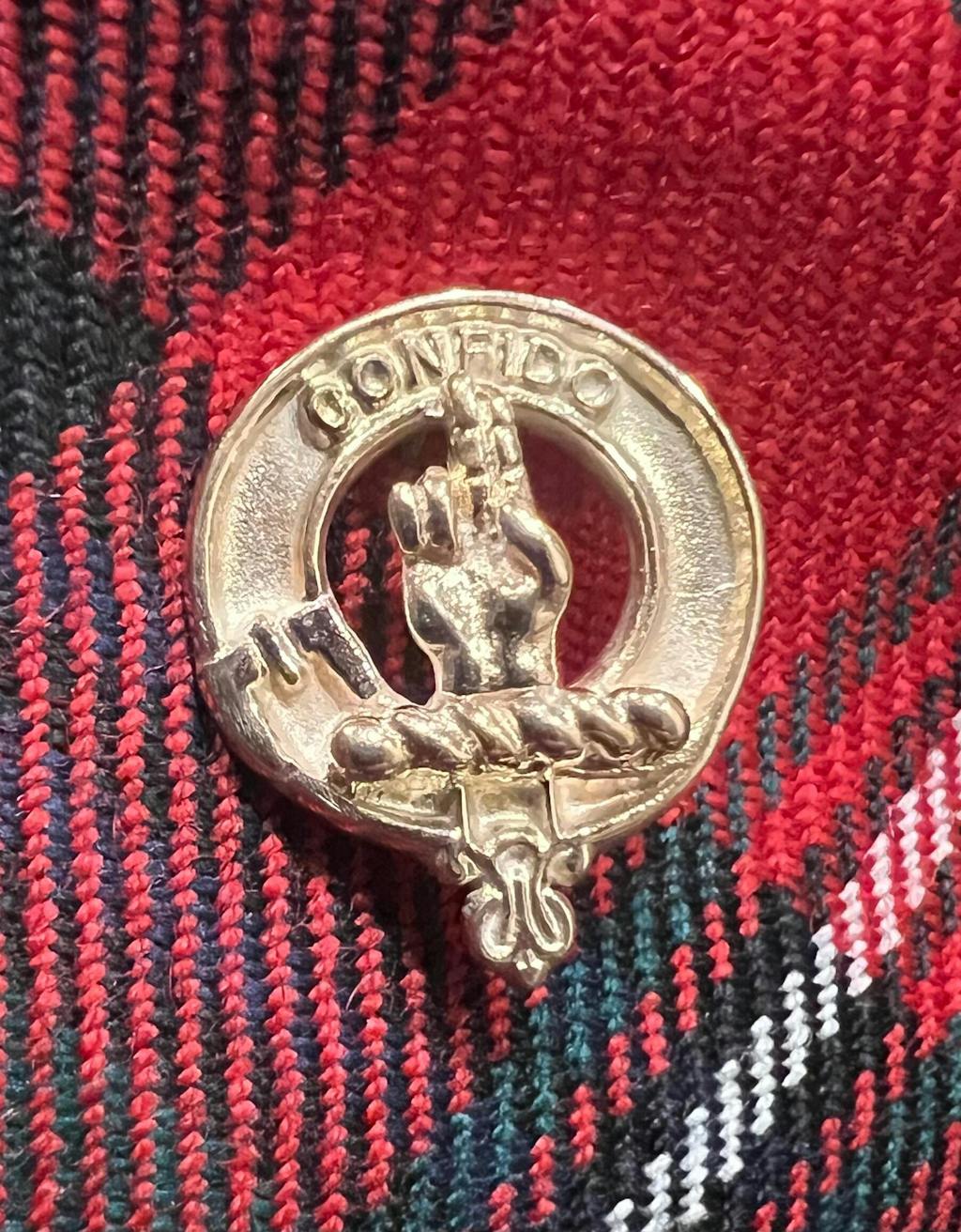 Your proud Scottish Clan heritage can be displayed by wearing your superb Scottish clan crest tie tack / lapel pin. Each Clan crest is exquisitely handcrafted in high detail in sterling silver, 10K or 14K solid gold. The clutch is unseen and is plated base metal. The Clan Crest is 11/16" (19.5mm) in diameter and weighs 4 to 5 grams. This piece is 3 dimensional and is individually made by “Lost Wax” casting then hand finished and polished.