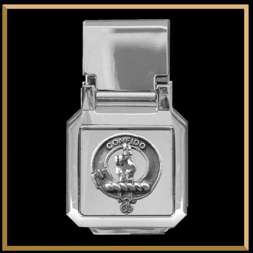 Your proud Scottish heritage can be displayed when you use this beautiful Scottish Clan crest money clip. The money clip is made of high quality stainless steel and measures 2 1/4" by 1 1/4" (57 mm x 32 mm). The Scottish Clan crest is exquisitely handcrafted and can be customized in your choice of pewter or sterling silver.