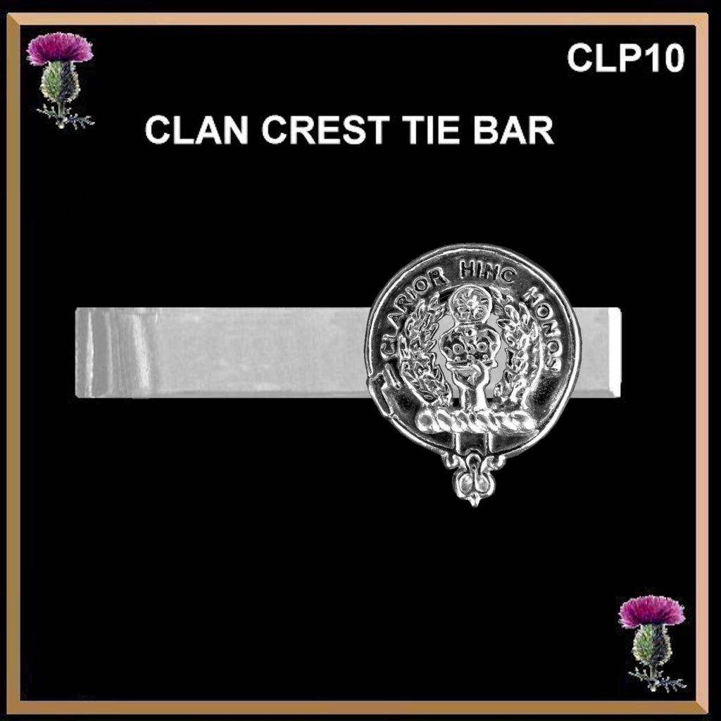 Your proud Scottish Clan heritage can be displayed by wearing your beautiful Scottish Clan clip tie bar. Each Clan tie bar is exquisitely handcrafted in high detail in lead free pewter or sterling silver and is mounted on a base metal tie bar. The Clan clip tie bar crest is 19.5 mm.