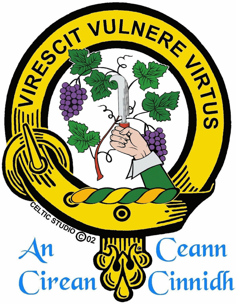 Our stunning Clan crest Iona bar brooch is a combination of old and new. The Iona bar design was first made on the small Holy Isle of Iona off the west coast of Scotland and the Clan crest is designed and made in our small Studio. The Iona bar is decorated with Celtic "bosses" on each end and is connected by a Celtic interlace design, the symbol of everlasting life. The Clan crest is suspended from the center of this antique design.