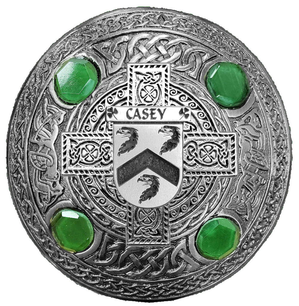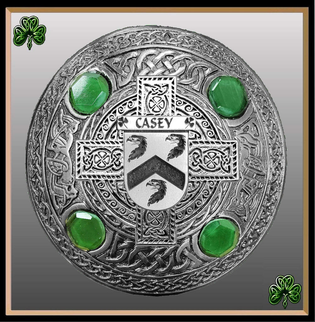 Casey Irish Coat of Arms Celtic Cross Plaid Brooch with Green Stones