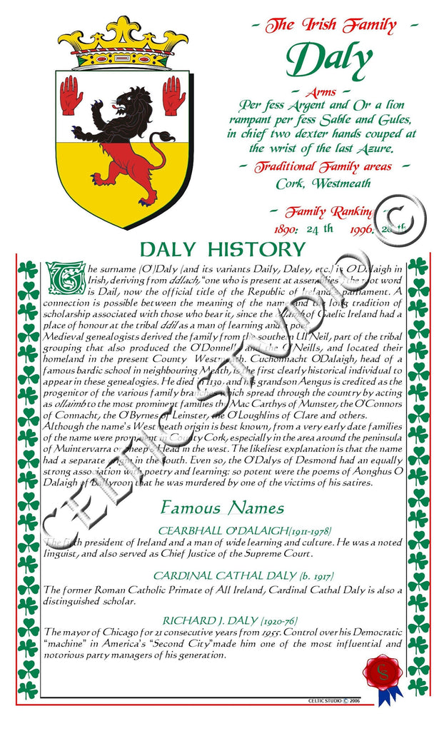 Your family's Irish history includes the Coat of Arms beautifully displayed in full colour with a description of the arms, traditional family areas and family ranking displayed beside it.