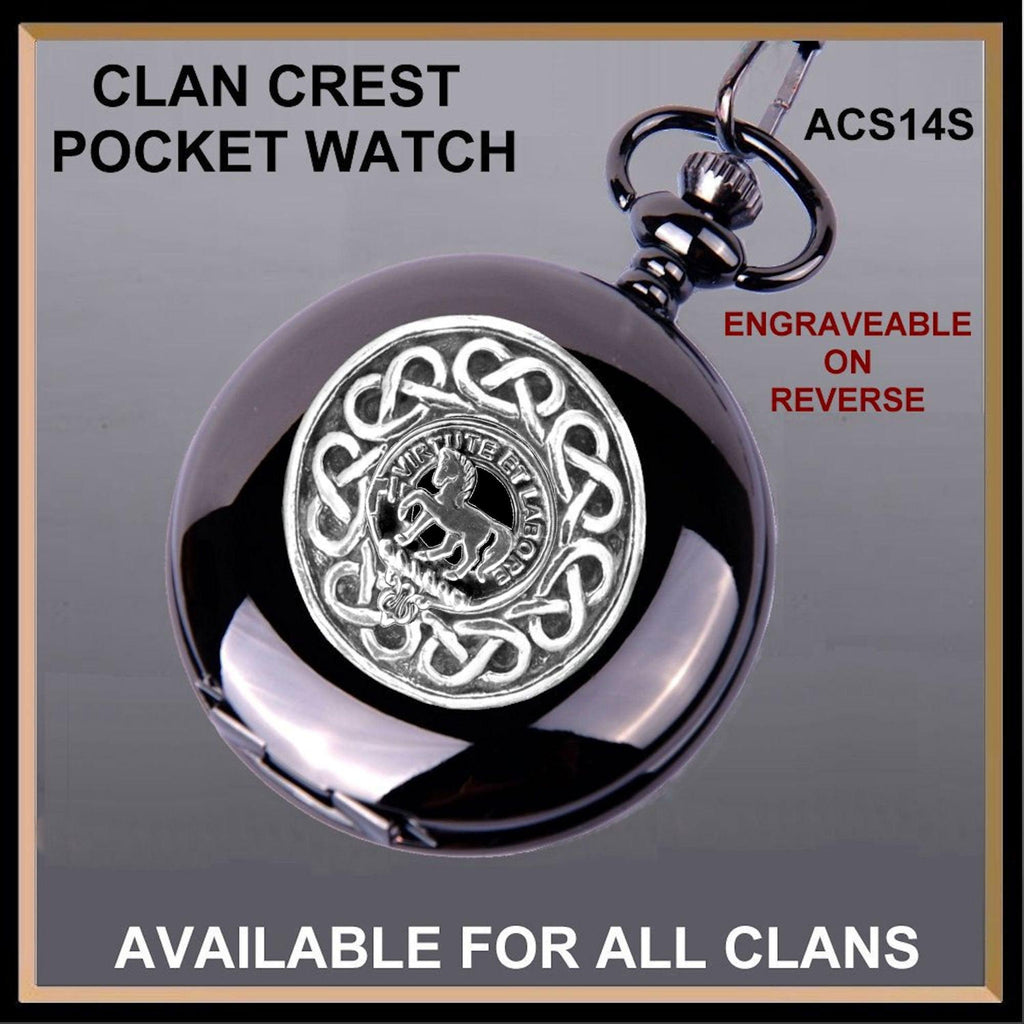The movement is precision quartz and is battery operated. The Clan crest watch includes an elegant removable matching alloy chain with a lobster claw clip at one end. The case is made of high quality scratch resistant stainless steel with a baked black mirror enamel. This pocket watch is the standard size for a pocket watch. The diameter is 1-13/16" (47 mm). The celtic interlace design mounted on the surface with the Clan crest is 1-3/16" (30 mm)