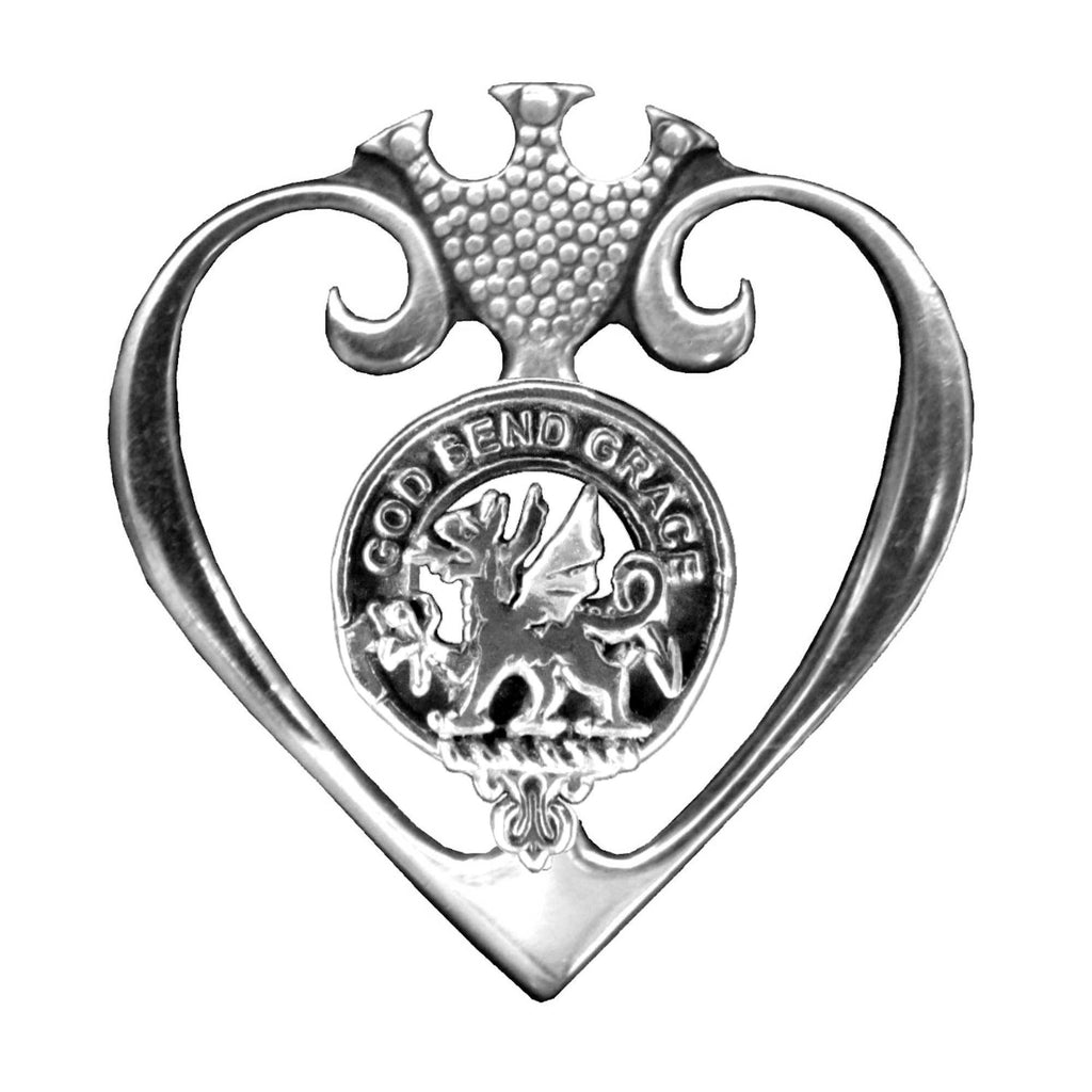 This stunning Clan Luckenbooth measures 1-7/16" (36 mm) by 1-1/2" (39 mm) with a high quality pin back or matching 18" chain in pewter or sterling silver. The Clan crest is 11/16" (17 mm) in diameter.