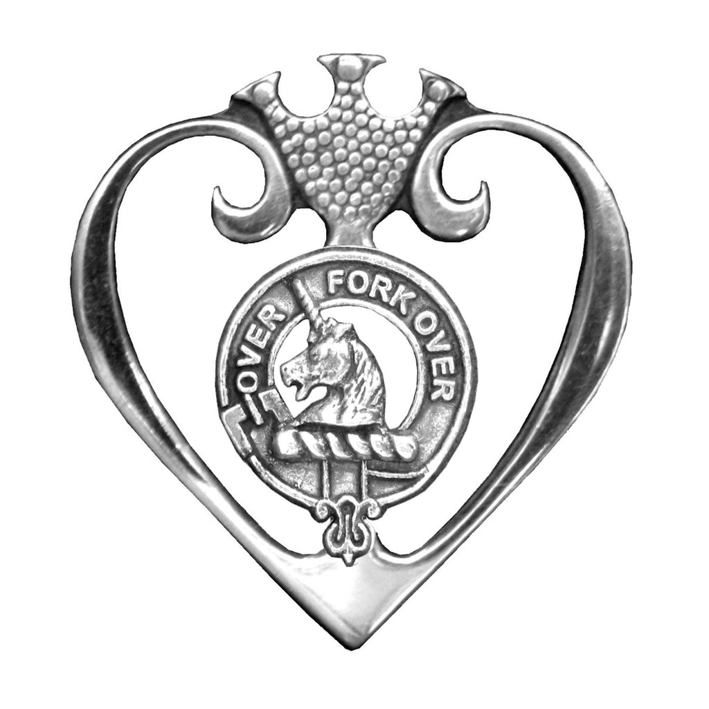 This stunning Clan Luckenbooth measures 1-7/16" (36 mm) by 1-1/2" (39 mm) with a high quality pin back or matching 18" chain in pewter or sterling silver. The Clan crest is 11/16" (17 mm) in diameter.