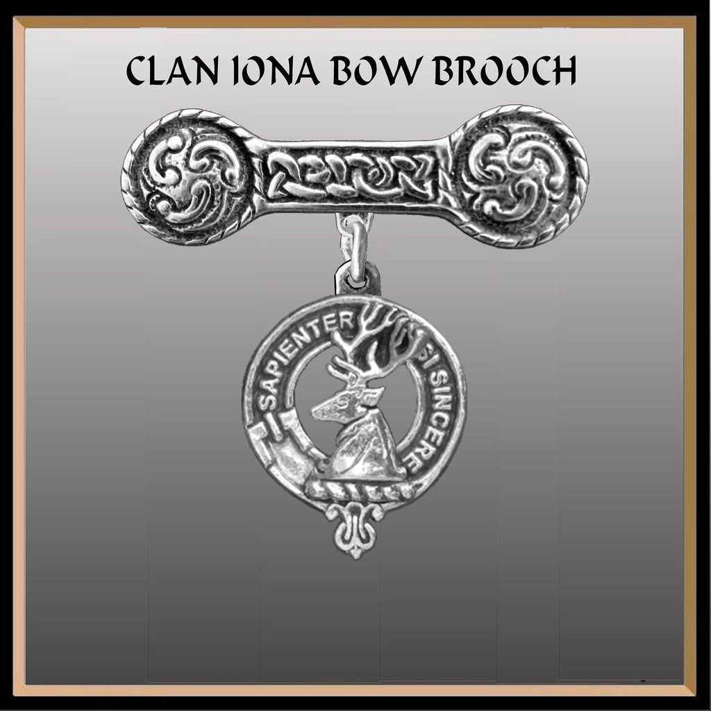 Our stunning Clan crest Iona bar brooch is a combination of old and new. The Iona bar design was first made on the small Holy Isle of Iona off the west coast of Scotland and the Clan crest is designed and made in our small Studio. The Iona bar is decorated with Celtic "bosses" on each end and is connected by a Celtic interlace design, the symbol of everlasting life. The Clan crest is suspended from the center of this antique design.