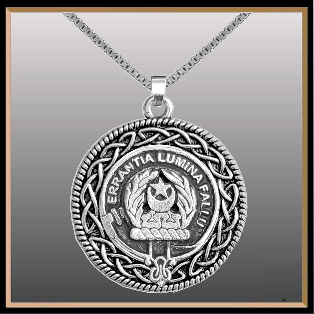 This beautiful pewter, sterling silver or karat gold pendant combines an intricate Celtic Interlace double knot scroll around the outside This interlace knot design symbolizes never ending life since there is no beginning and no end. Your unique Clan crest mounted in the centre of the interlace design to give a dramatic presentation.