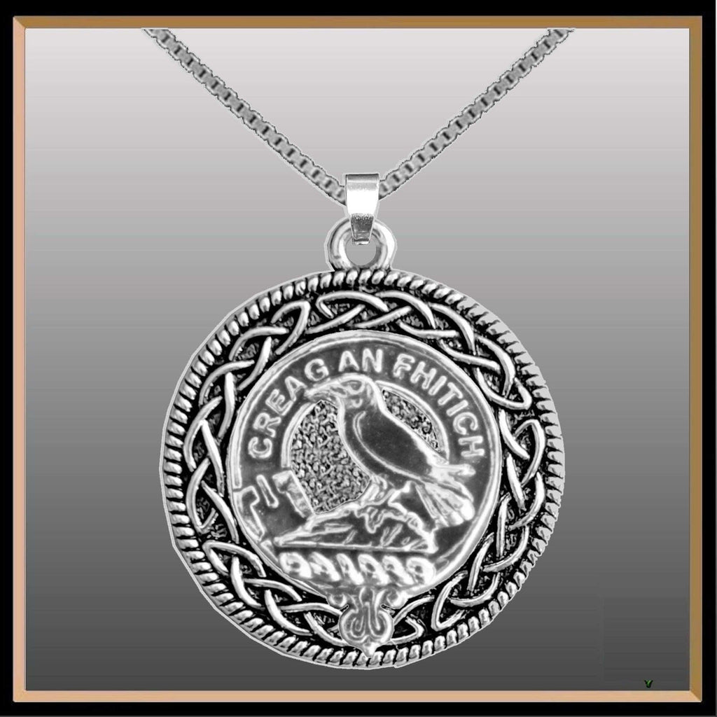 This beautiful pewter, sterling silver or karat gold pendant combines an intricate Celtic Interlace double knot scroll around the outside This interlace knot design symbolizes never ending life since there is no beginning and no end. Your unique Clan crest mounted in the centre of the interlace design to give a dramatic presentation.