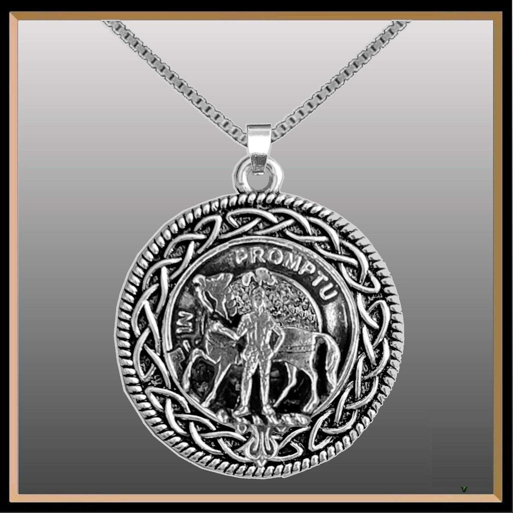 This beautiful pewter, sterling silver or karat gold pendant combines an intricate Celtic Interlace double knot scroll around the outside This interlace knot design symbolizes never ending life since there is no beginning and no end. Your unique Clan crest mounted in the centre of the interlace design to give a dramatic presentation.