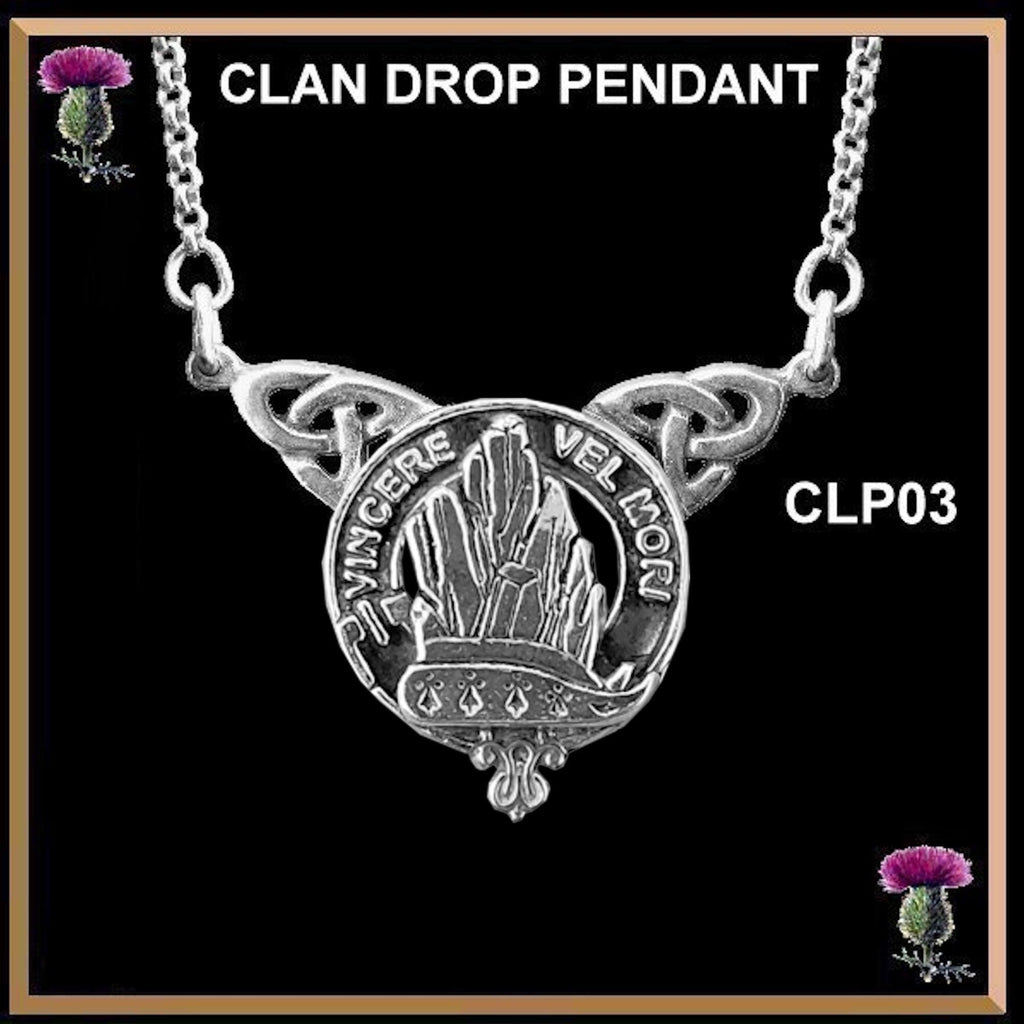 Your proud Scottish Clan heritage can be displayed by wearing this beautiful Clan drop pendant. This exquisite Celtic interlace pendant is a beautifully elegant way to show your Clan crest.