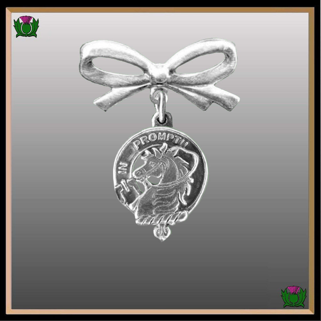 Each Celtic Studio Clan crest is exquisitely handcrafted in high detail in your choice of pewter, sterling silver or karat gold. The Clan Crest is 11/16" in diameter and the bow is 1" long with a high quality nickel silver bar pin clasp.
