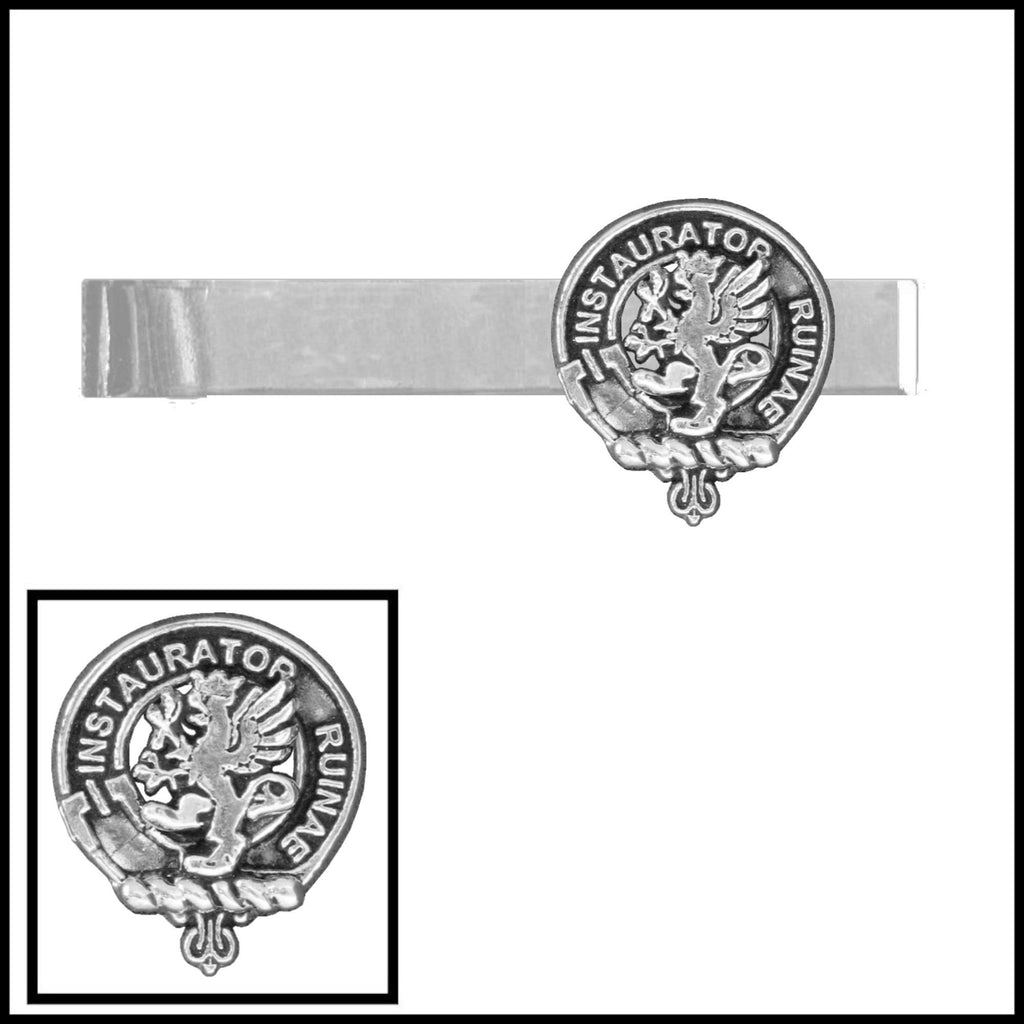 Your proud Scottish Clan heritage can be displayed by wearing your beautiful Scottish Clan clip tie bar. Each Clan tie bar is exquisitely handcrafted in high detail in lead free pewter or sterling silver and is mounted on a base metal tie bar. The Clan clip tie bar crest is 19.5 mm.