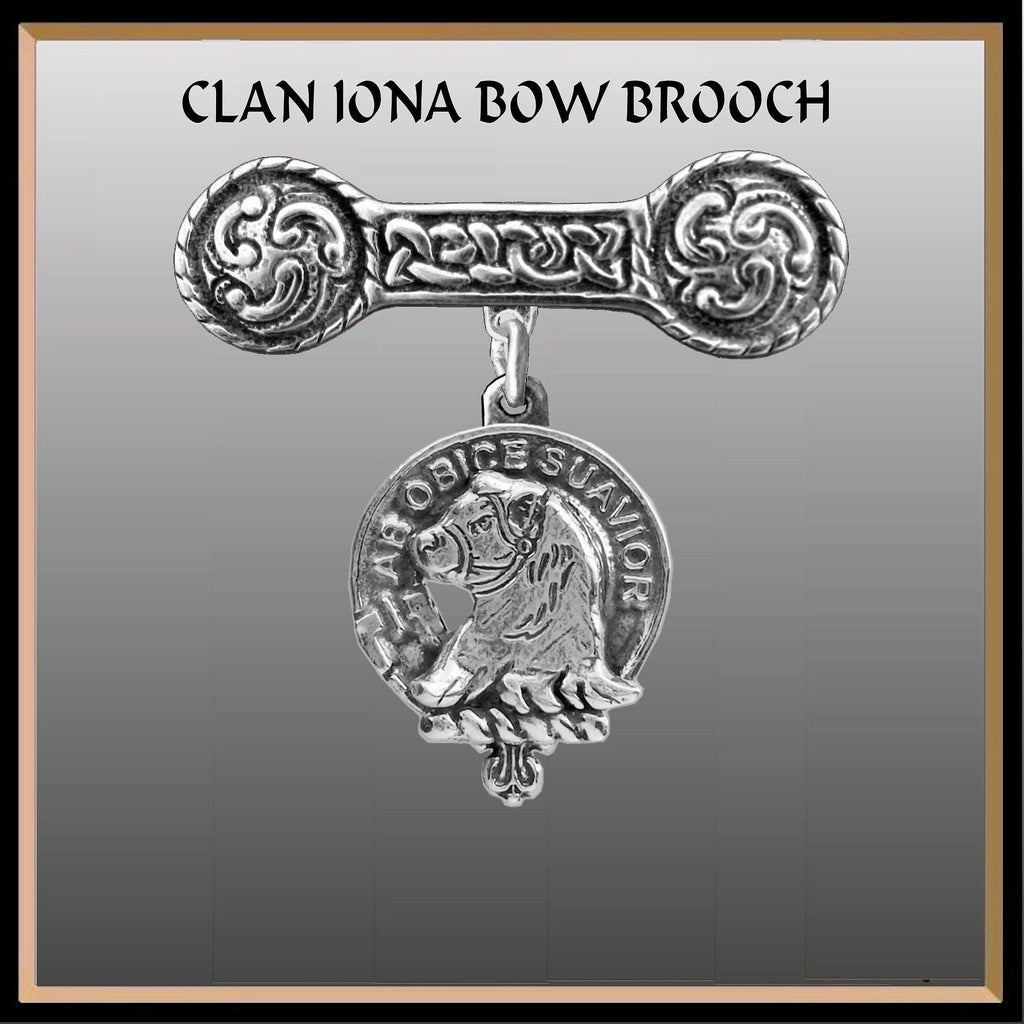 Our stunning Clan crest Iona bar brooch is a combination of old and new. The Iona bar design was first made on the small Holy Isle of Iona off the west coast of Scotland and the Clan crest is designed and made in our small Studio. The Iona bar is decorated with Celtic "bosses" on each end and is connected by a Celtic interlace design, the symbol of everlasting life. The Clan crest is suspended from the center of this antique design.