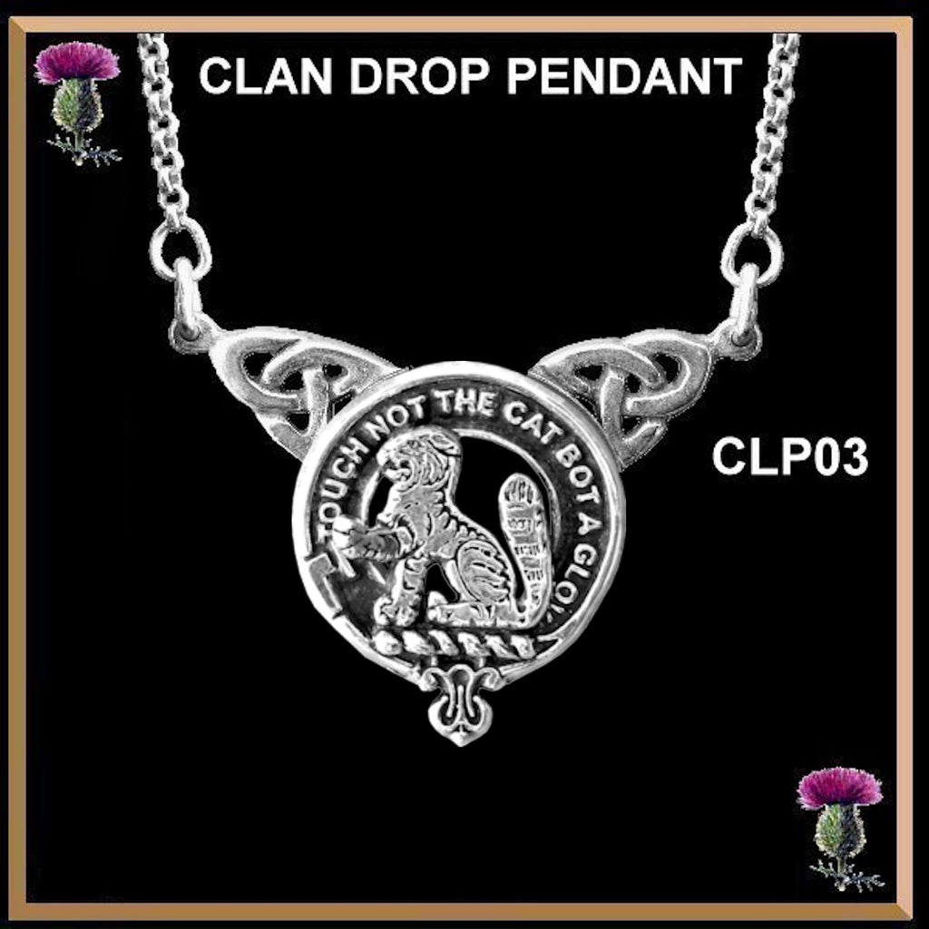 Your proud Scottish Clan heritage can be displayed by wearing this beautiful Clan drop pendant. This exquisite Celtic interlace pendant is a beautifully elegant way to show your Clan crest.