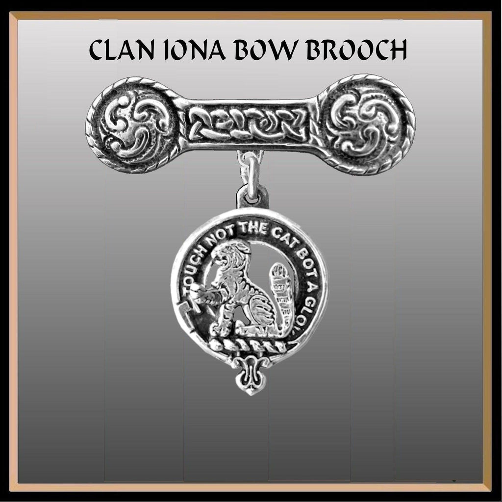 Our stunning Clan crest Iona bar brooch is a combination of old and new. The Iona bar design was first made on the small Holy Isle of Iona off the west coast of Scotland and the Clan crest is designed and made in our small Studio. The Iona bar is decorated with Celtic "bosses" on each end and is connected by a Celtic interlace design, the symbol of everlasting life. The Clan crest is suspended from the center of this antique design.