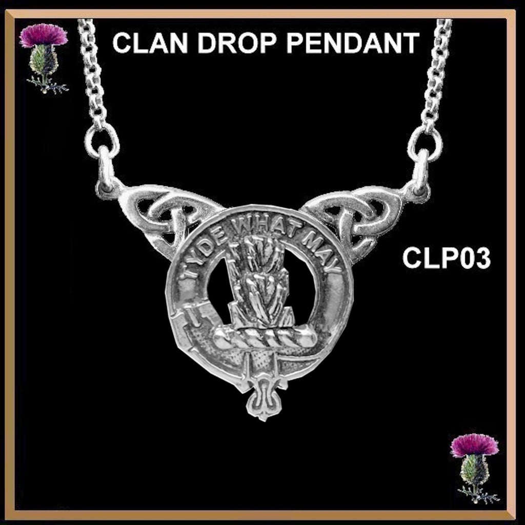 Your proud Scottish Clan heritage can be displayed by wearing this beautiful Clan drop pendant. This exquisite Celtic interlace pendant is a beautifully elegant way to show your Clan crest.