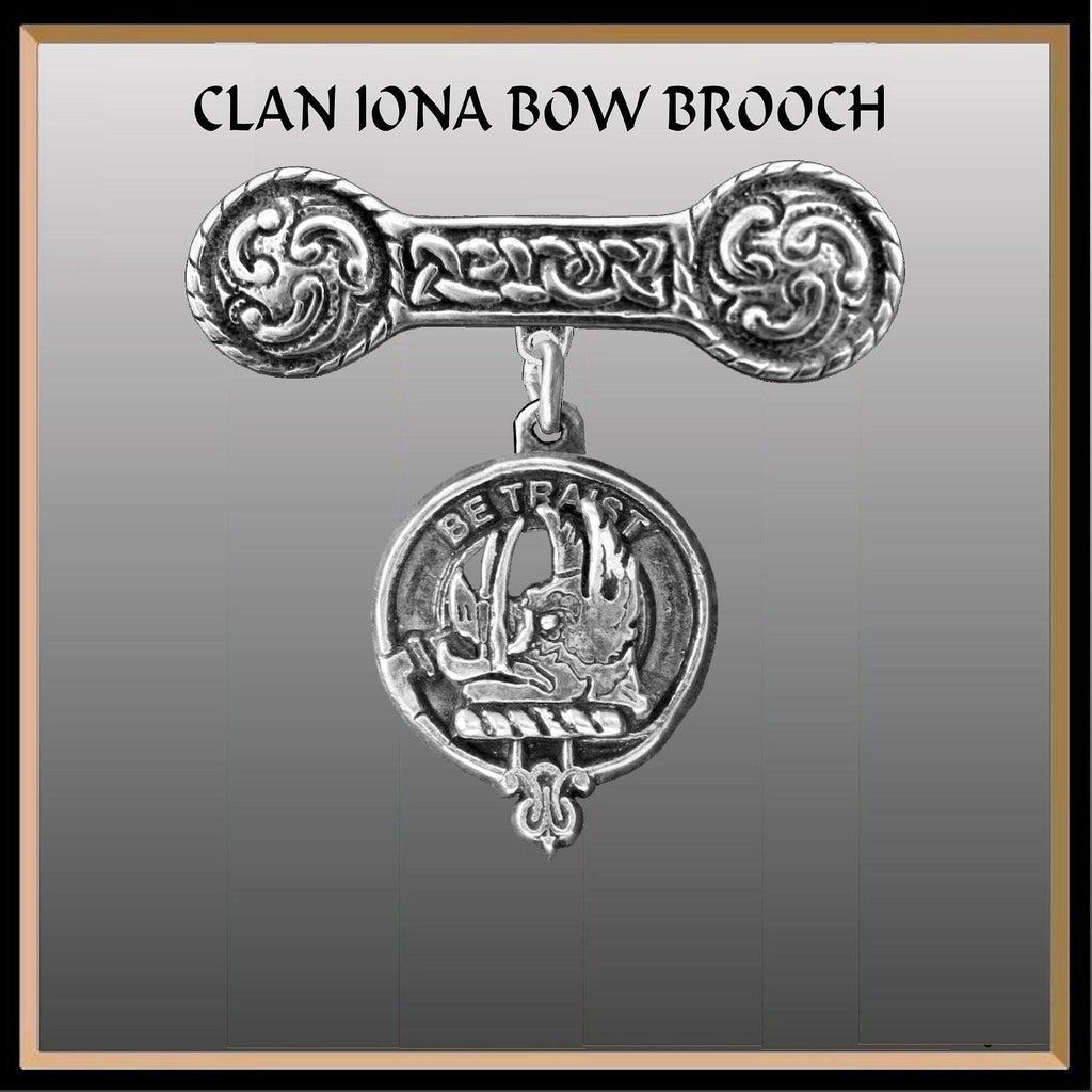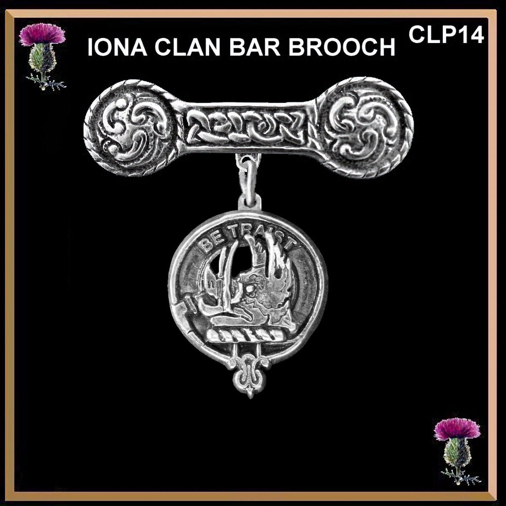 Our stunning Clan crest Iona bar brooch is a combination of old and new. The Iona bar design was first made on the small Holy Isle of Iona off the west coast of Scotland and the Clan crest is designed and made in our small Studio. The Iona bar is decorated with Celtic "bosses" on each end and is connected by a Celtic interlace design, the symbol of everlasting life. The Clan crest is suspended from the center of this antique design.