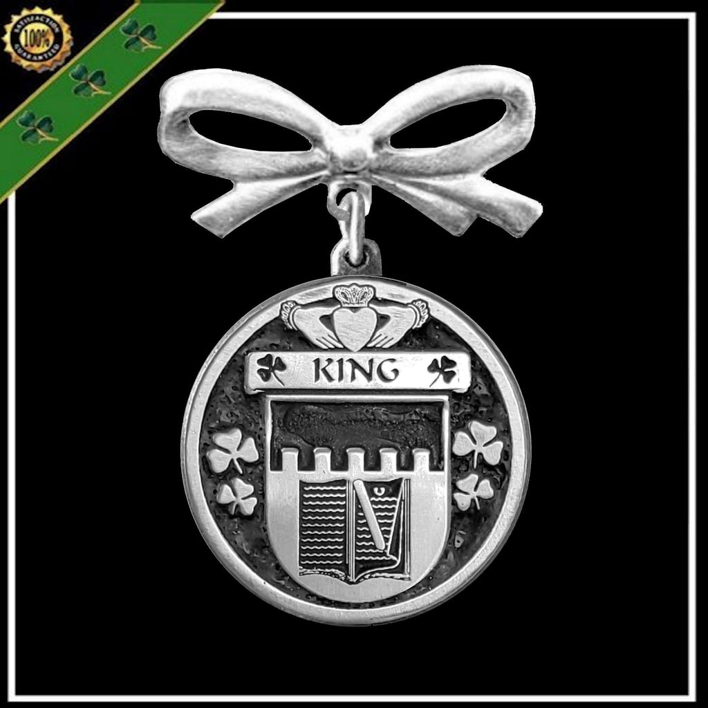 Each Celtic Studio Irish disk bow brooch is exquisitely handcrafted in high detail in your choice of pewter, sterling silver or karat gold. The Irish disk Coat of Arms is 11/16" (19.50 mm) in diameter and the bow is 1" wide with a high quality nickel silver bar pin clasp.
