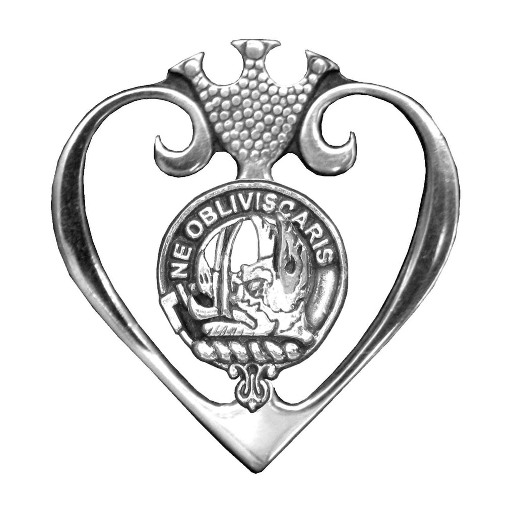 This stunning Clan Luckenbooth measures 1-7/16" (36 mm) by 1-1/2" (39 mm) with a high quality pin back or matching 18" chain in pewter or sterling silver. The Clan crest is 11/16" (17 mm) in diameter.