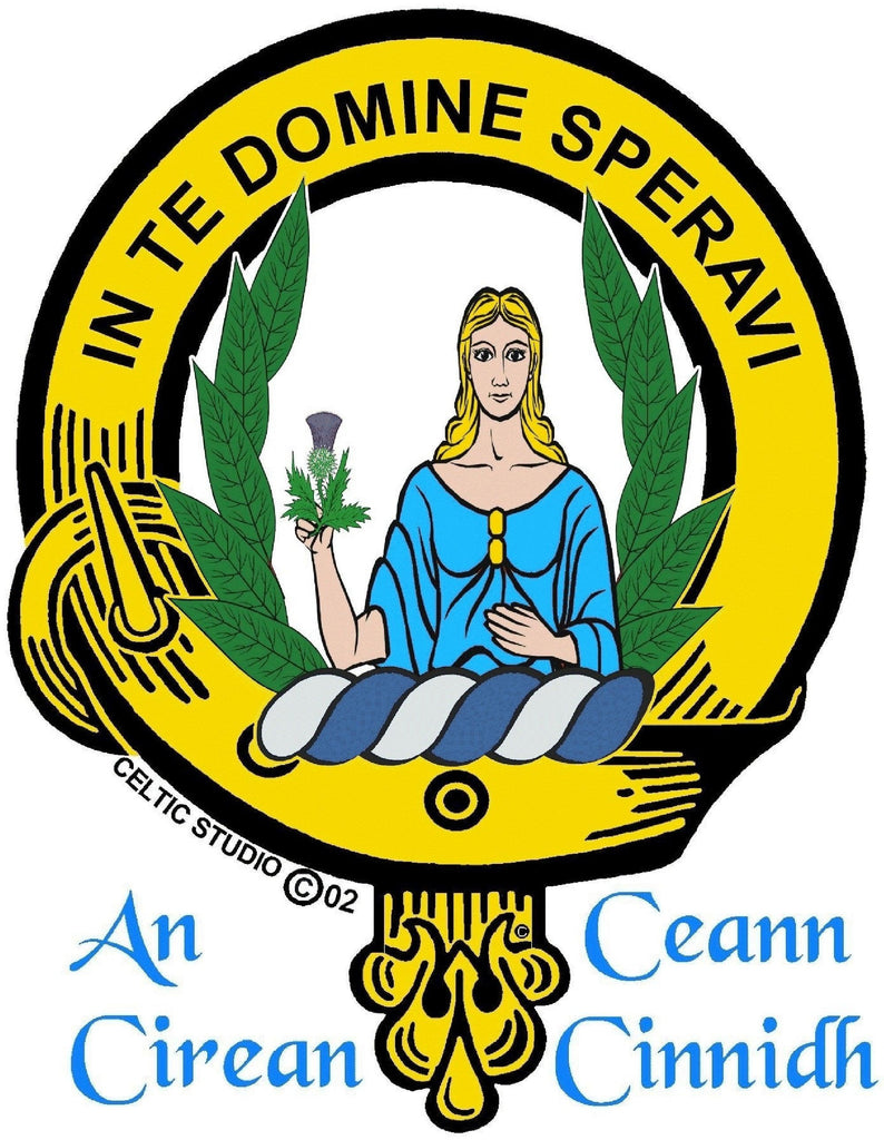 The Clan crest is surrounded by a detailed belt and buckle design upon which is inscribed your Clan motto in raised relief lettering. In ancient times, the chief of the Clan presented to his Clansmen his crest for them to wear as a symbol of their loyalty and Clan affiliation. The crest area is 1 1/4" square (32 mm) and the Clan Crest is 11/16" (19.5 mm) in diameter.