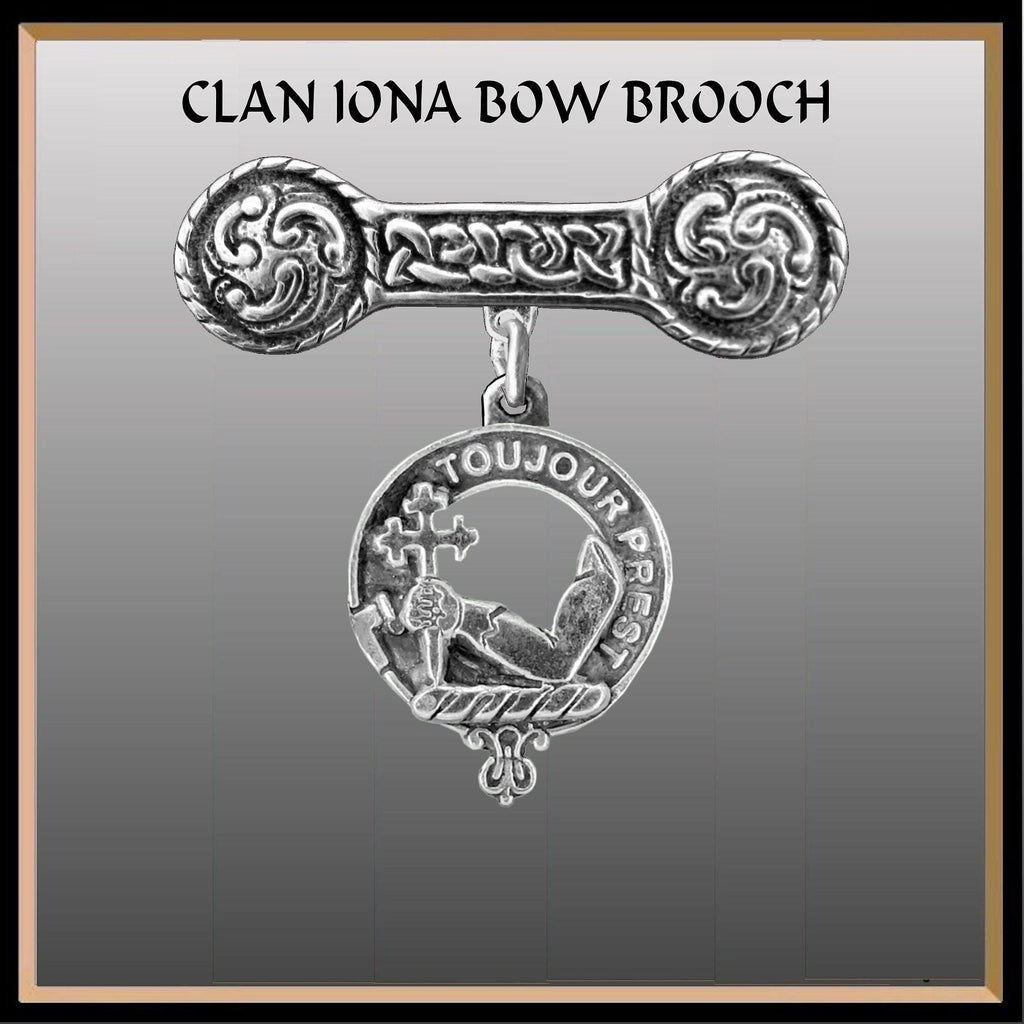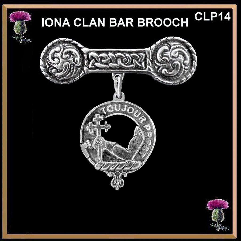 Our stunning Clan crest Iona bar brooch is a combination of old and new. The Iona bar design was first made on the small Holy Isle of Iona off the west coast of Scotland and the Clan crest is designed and made in our small Studio. The Iona bar is decorated with Celtic "bosses" on each end and is connected by a Celtic interlace design, the symbol of everlasting life. The Clan crest is suspended from the center of this antique design.