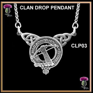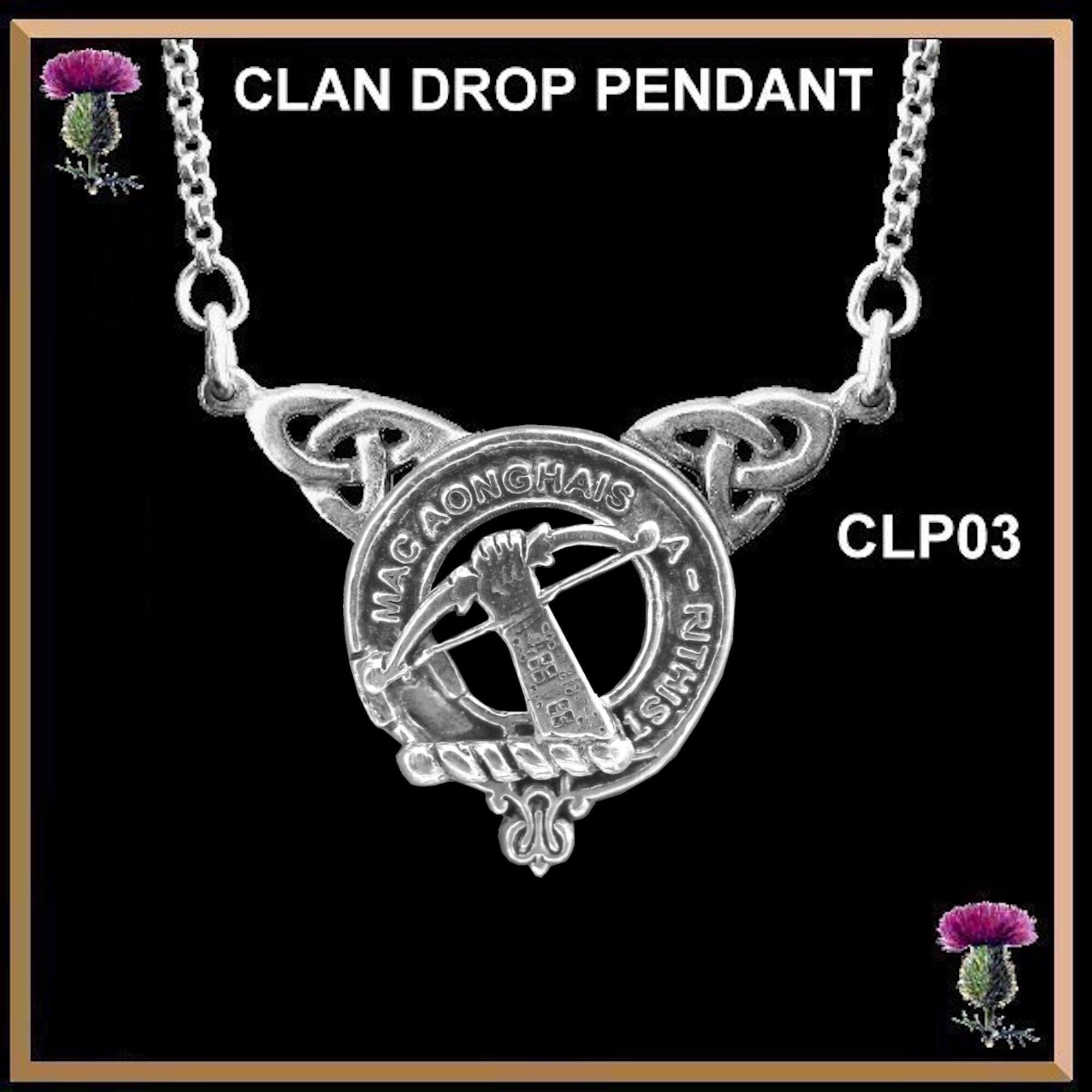 Your proud Scottish Clan heritage can be displayed by wearing this beautiful Clan drop pendant. This exquisite Celtic interlace pendant is a beautifully elegant way to show your Clan crest.
