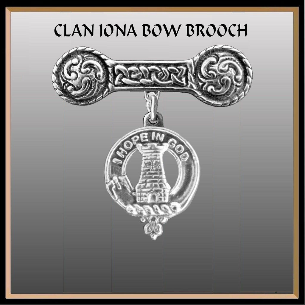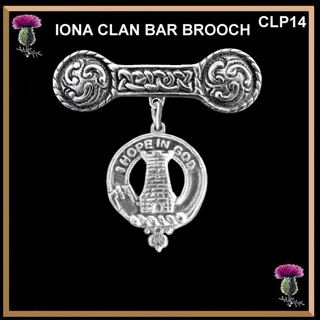 Our stunning Clan crest Iona bar brooch is a combination of old and new. The Iona bar design was first made on the small Holy Isle of Iona off the west coast of Scotland and the Clan crest is designed and made in our small Studio. The Iona bar is decorated with Celtic "bosses" on each end and is connected by a Celtic interlace design, the symbol of everlasting life. The Clan crest is suspended from the center of this antique design.