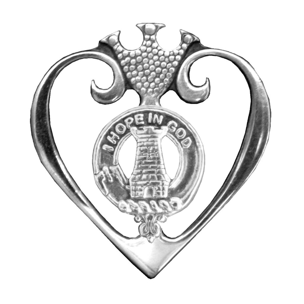 This stunning Clan Luckenbooth measures 1-7/16" (36 mm) by 1-1/2" (39 mm) with a high quality pin back or matching 18" chain in pewter or sterling silver. The Clan crest is 11/16" (17 mm) in diameter.