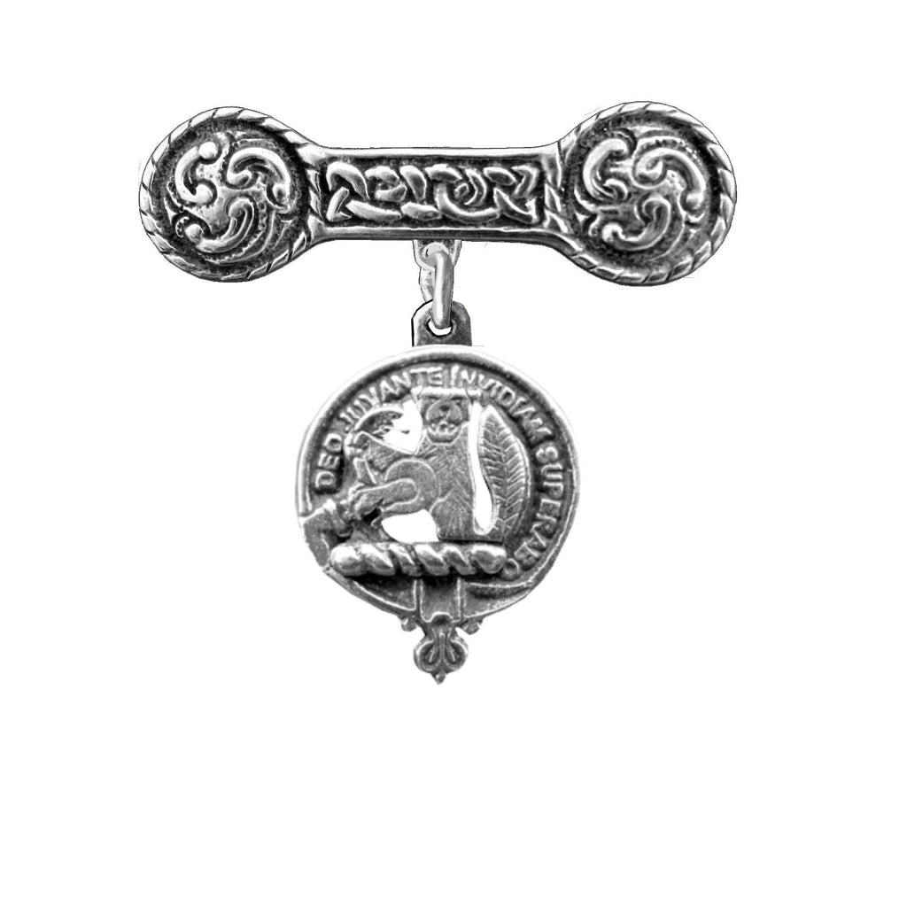Our stunning Clan crest Iona bar brooch is a combination of old and new. The Iona bar design was first made on the small Holy Isle of Iona off the west coast of Scotland and the Clan crest is designed and made in our small Studio. The Iona bar is decorated with Celtic "bosses" on each end and is connected by a Celtic interlace design, the symbol of everlasting life. The Clan crest is suspended from the center of this antique design.