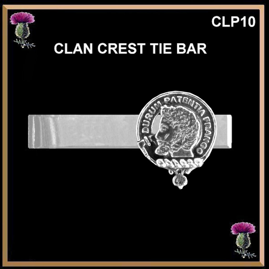 Your proud Scottish Clan heritage can be displayed by wearing your beautiful Scottish Clan clip tie bar. Each Clan tie bar is exquisitely handcrafted in high detail in lead free pewter or sterling silver and is mounted on a base metal tie bar. The Clan clip tie bar crest is 19.5 mm.