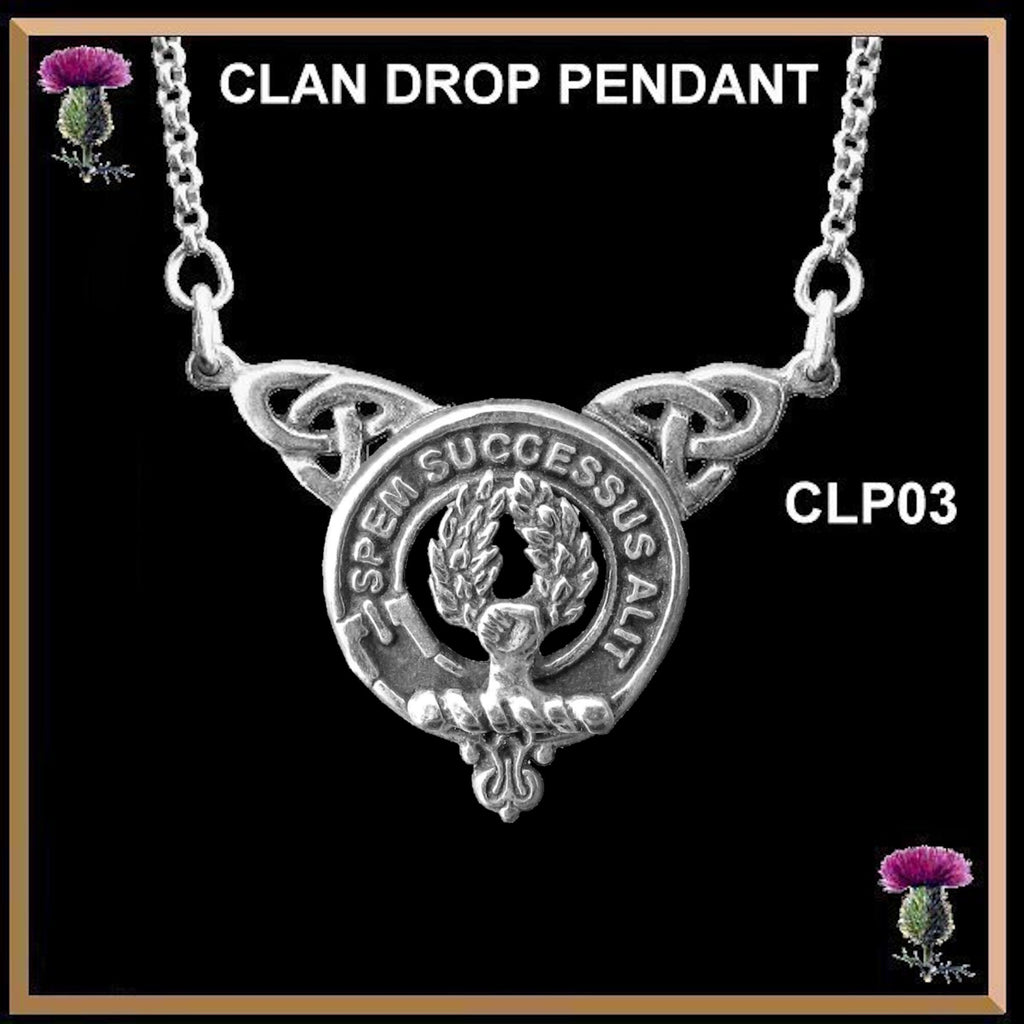 Your proud Scottish Clan heritage can be displayed by wearing this beautiful Clan drop pendant. This exquisite Celtic interlace pendant is a beautifully elegant way to show your Clan crest.