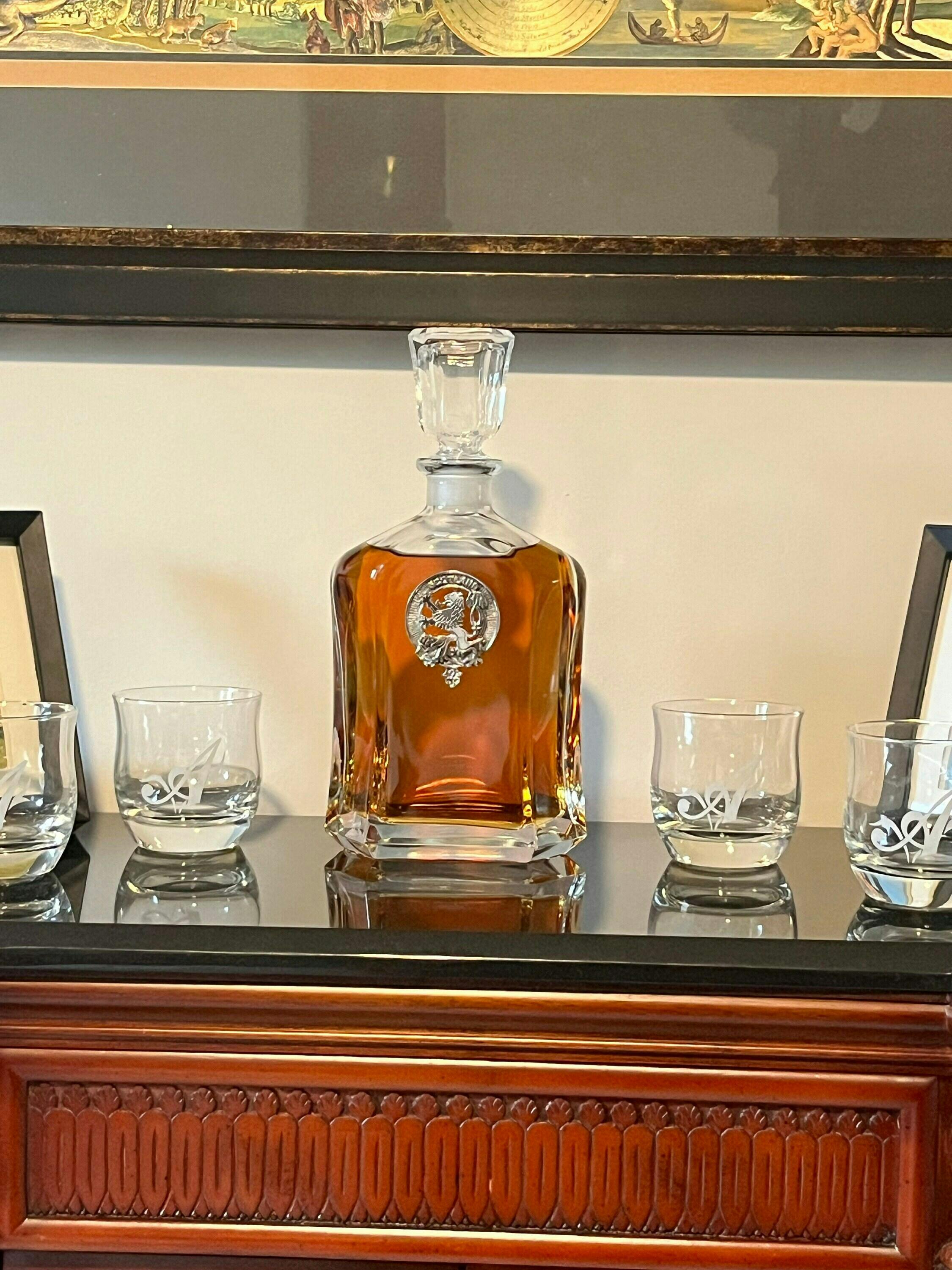 Show your proud Scottish heritage with our superb Clan "Skye" elegant decanter. Your pewter or sterling silver Clan crest badge is centrally mounted on the decanter. All major Clans are available.
