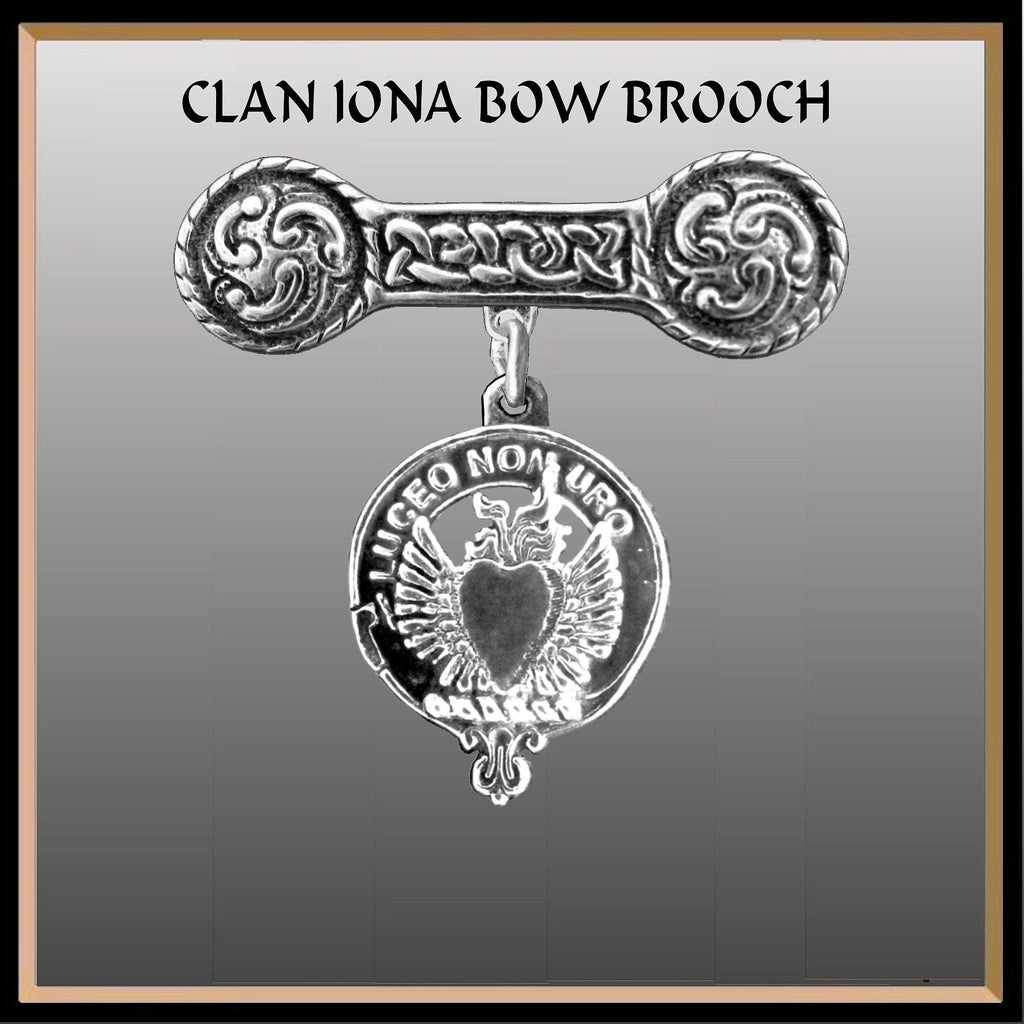 Our stunning Clan crest Iona bar brooch is a combination of old and new. The Iona bar design was first made on the small Holy Isle of Iona off the west coast of Scotland and the Clan crest is designed and made in our small Studio. The Iona bar is decorated with Celtic "bosses" on each end and is connected by a Celtic interlace design, the symbol of everlasting life. The Clan crest is suspended from the center of this antique design.