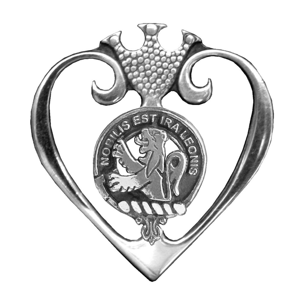 This stunning Clan Luckenbooth measures 1-7/16" (36 mm) by 1-1/2" (39 mm) with a high quality pin back or matching 18" chain in pewter or sterling silver. The Clan crest is 11/16" (17 mm) in diameter.