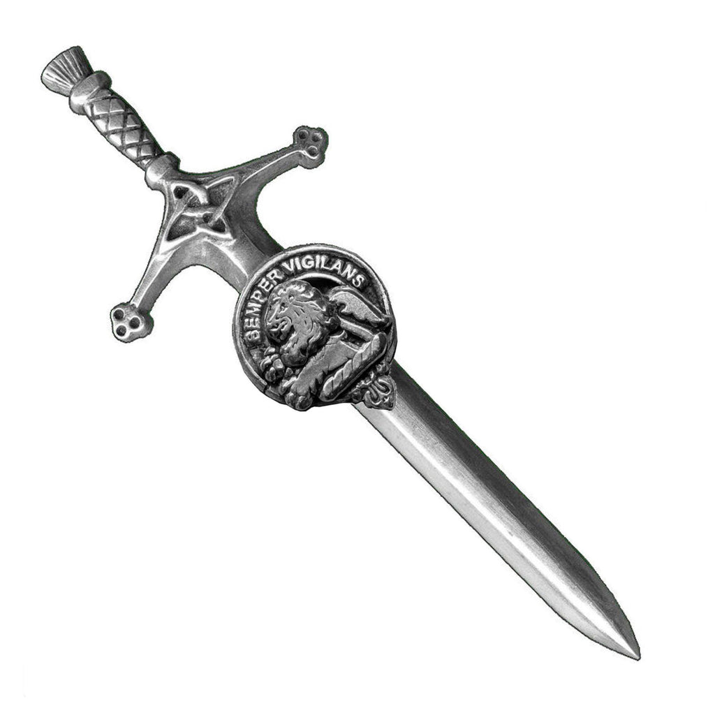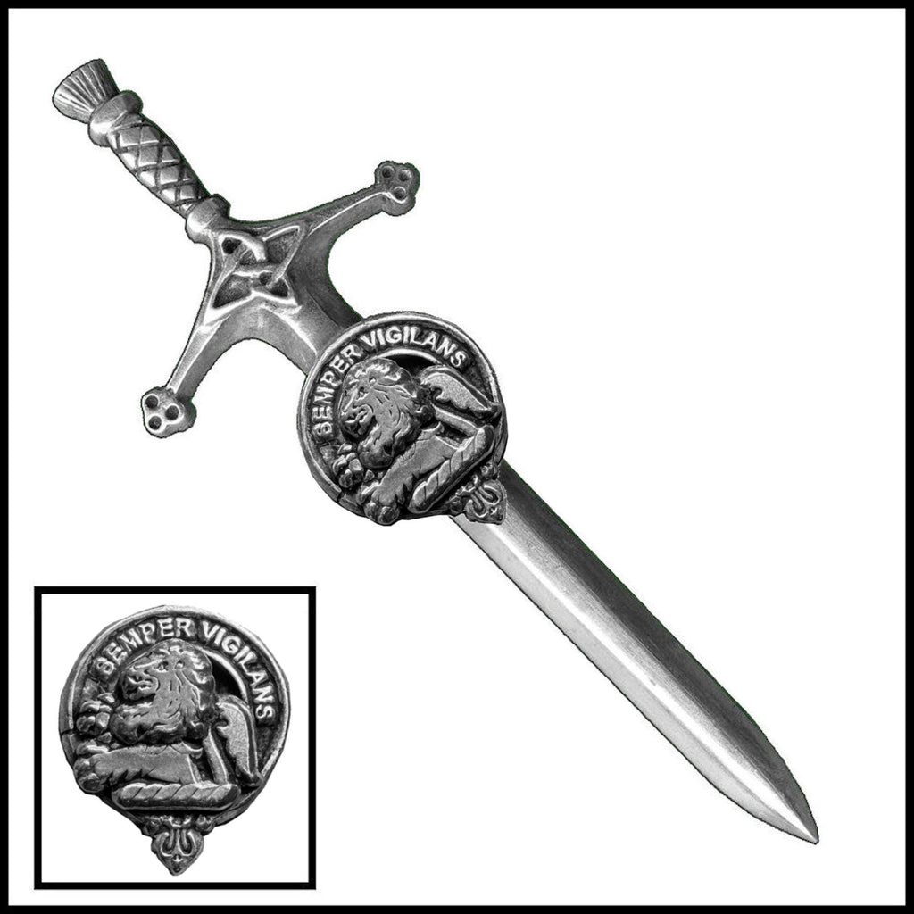 Your proud Scottish Clan heritage can be displayed with this high quality Clan crest kilt pin. The overall length is 3-7/8" (98.5 mm) and is 1-5/16" (33.3 mm) across the handle of the sword.