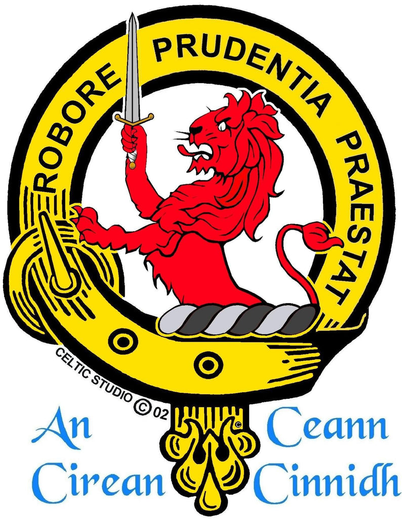 Our badges are extremely fine in detail. The Clan crest is surrounded by a detailed three dimensional belt and buckle design with the motto in raised relief lettering. This beautiful Clan badge is 1-3/4 " (45mm) W x 2-1/4" (57mm) L and is mounted in the center of your kilt buckle.