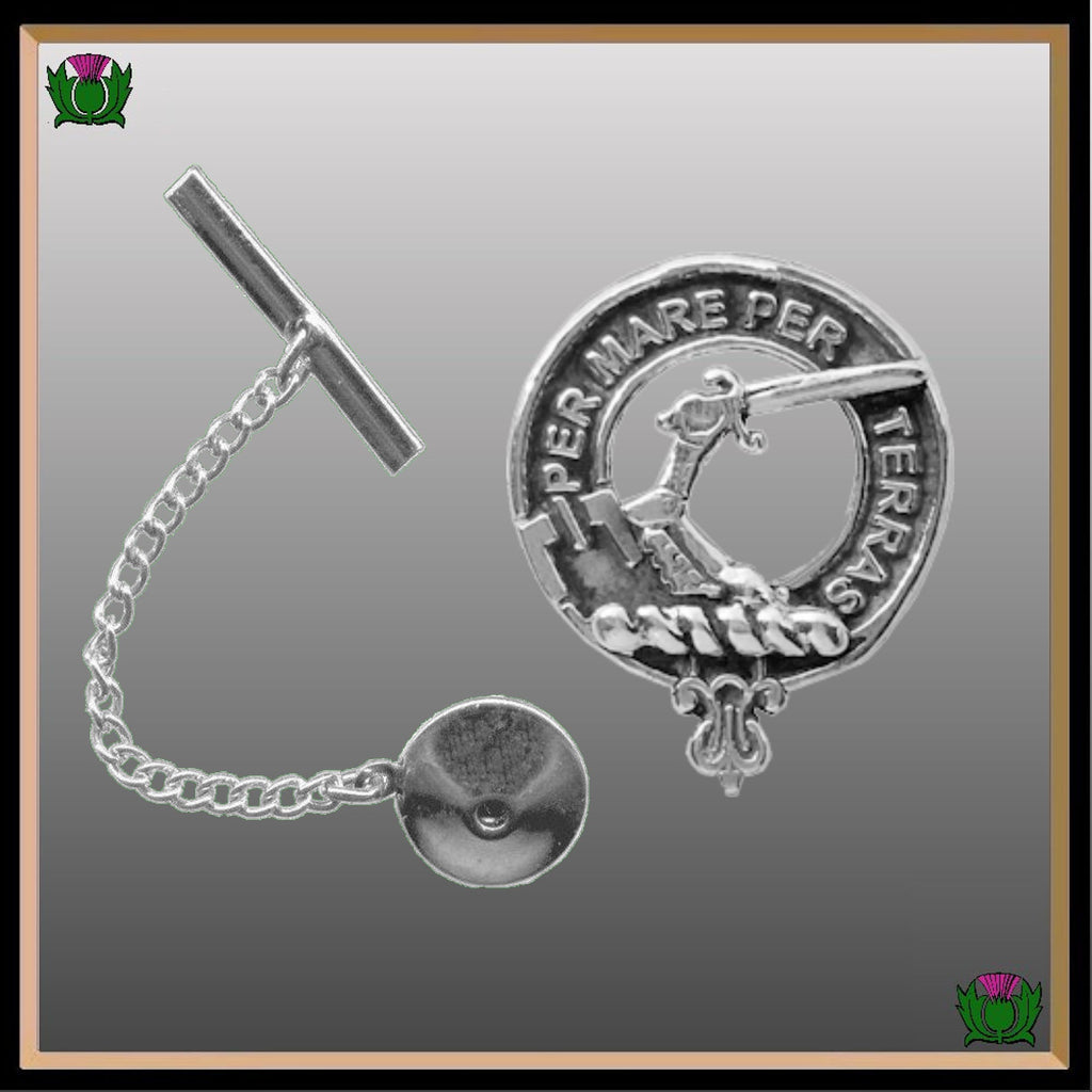 Your proud Scottish Clan heritage can be displayed through this superb clan crest tie tack / lapel pin. Each crest is exquisitely handcrafted in high detail in sterling silver while the clutch is of a base metal. The Clan Crest is 11/16" (19.5mm) in diameter.