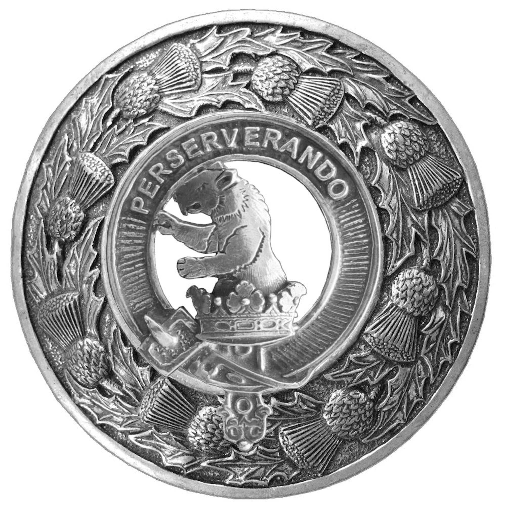 The pewter or sterling silver Clan badge mounted on the brooch is sculpted in extremely fine detail in sterling silver or lead free pewter. The Clan badge is 2" (50.8 mm) wide and is mounted in the center of the Plaid brooch. The Clan badge is surrounded by a detailed three dimensional belt and buckle design with the clan motto in raised relief lettering.