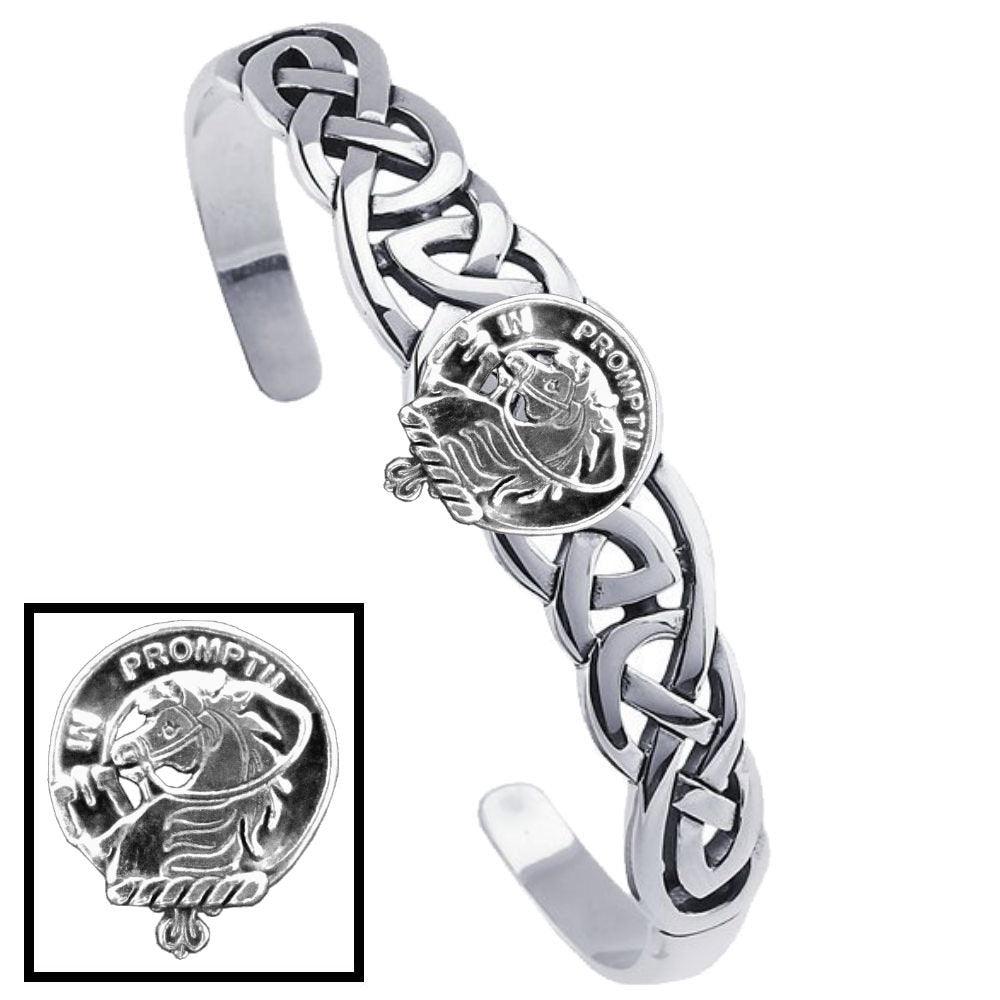 A superb high quality Celtic Interlace cuff bracelet with your Clan Crest solidly made in solid sterling silver. The bracelet is created with an intricate Celtic weave pattern. This attractive bracelet fits any wrist size. A great way to display your unique Clan affiliation or just because you love everything Celtic! All Clans are available. The Celtic Interlace design is the symbol of eternal life or all things that last forever! Like love for that special person in your life.