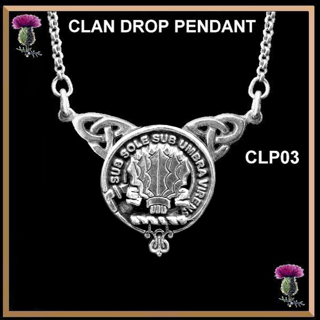 Your proud Scottish Clan heritage can be displayed by wearing this beautiful Clan drop pendant. This exquisite Celtic interlace pendant is a beautifully elegant way to show your Clan crest.