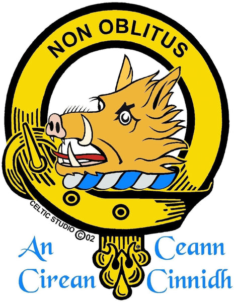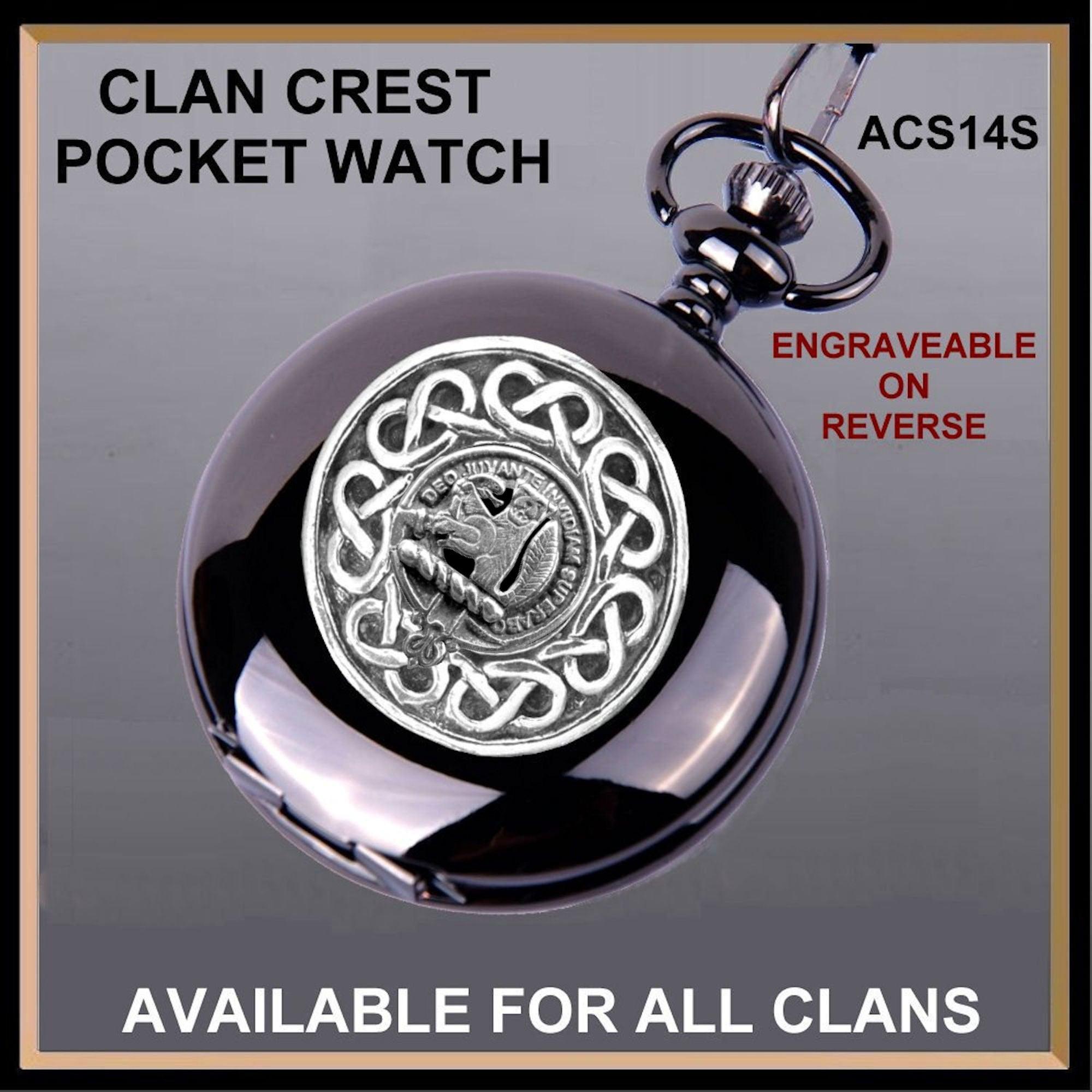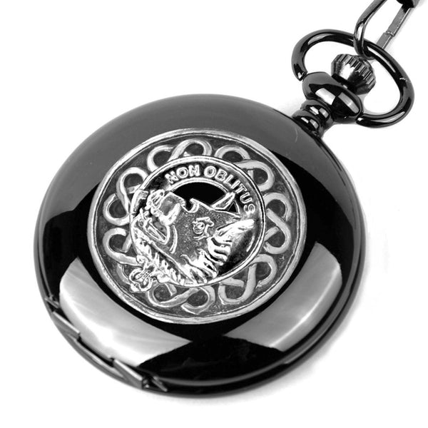 The movement is precision quartz and is battery operated. The Clan crest watch includes an elegant removable matching alloy chain with a lobster claw clip at one end. The case is made of high quality scratch resistant stainless steel with a baked black mirror enamel. This pocket watch is the standard size for a pocket watch. The diameter is 1-13/16" (47 mm). The celtic interlace design mounted on the surface with the Clan crest is 1-3/16" (30 mm)