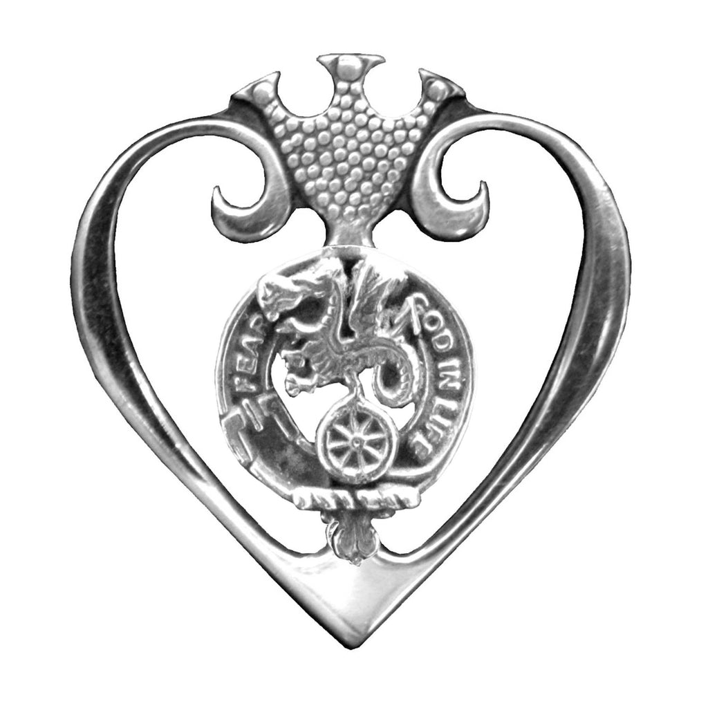 This stunning Clan Luckenbooth measures 1-7/16" (36 mm) by 1-1/2" (39 mm) with a high quality pin back or matching 18" chain in pewter or sterling silver. The Clan crest is 11/16" (17 mm) in diameter.