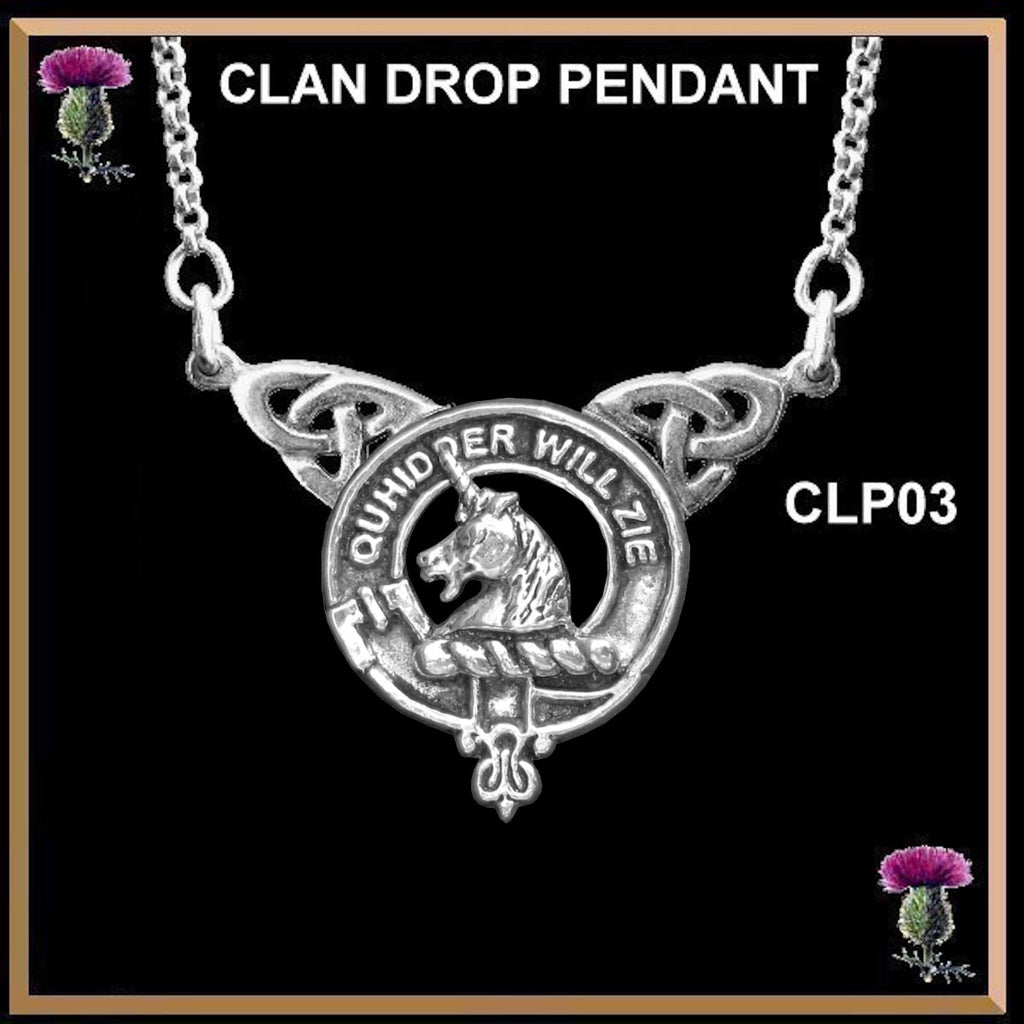 Your proud Scottish Clan heritage can be displayed by wearing this beautiful Clan drop pendant. This exquisite Celtic interlace pendant is a beautifully elegant way to show your Clan crest.