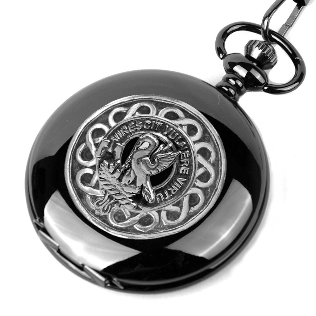 The movement is precision quartz and is battery operated. The Clan crest watch includes an elegant removable matching alloy chain with a lobster claw clip at one end. The case is made of high quality scratch resistant stainless steel with a baked black mirror enamel. This pocket watch is the standard size for a pocket watch. The diameter is 1-13/16" (47 mm). The celtic interlace design mounted on the surface with the Clan crest is 1-3/16" (30 mm)