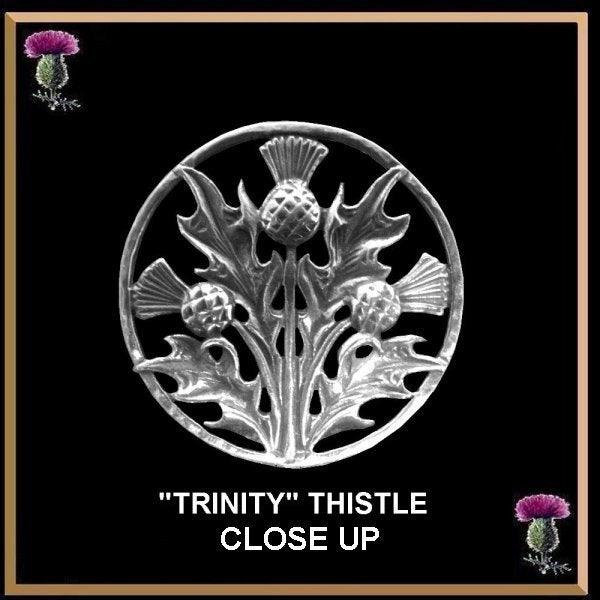 Scotland's national emblem comes to life in this beautifully handcrafted Trinity Thistle Small Kilt Pin. This traditional design features a bloom of three thistles inside a circle. As with many Celtic/Scottish designs there are a myriad of meanings sent forth in the design.