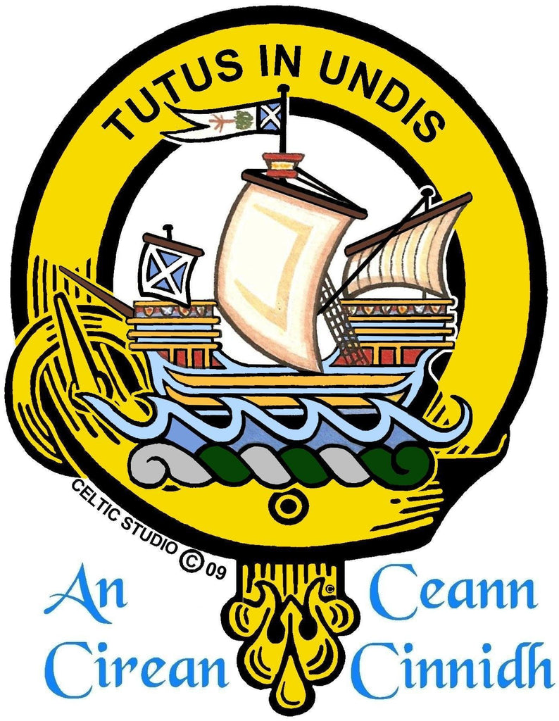 Our badges are extremely fine in detail. The Clan crest is surrounded by a detailed three dimensional belt and buckle design with the motto in raised relief lettering. This beautiful Clan badge is 1-3/4 " (45mm) W x 2-1/4" (57mm) L and is mounted in the center of your kilt buckle.